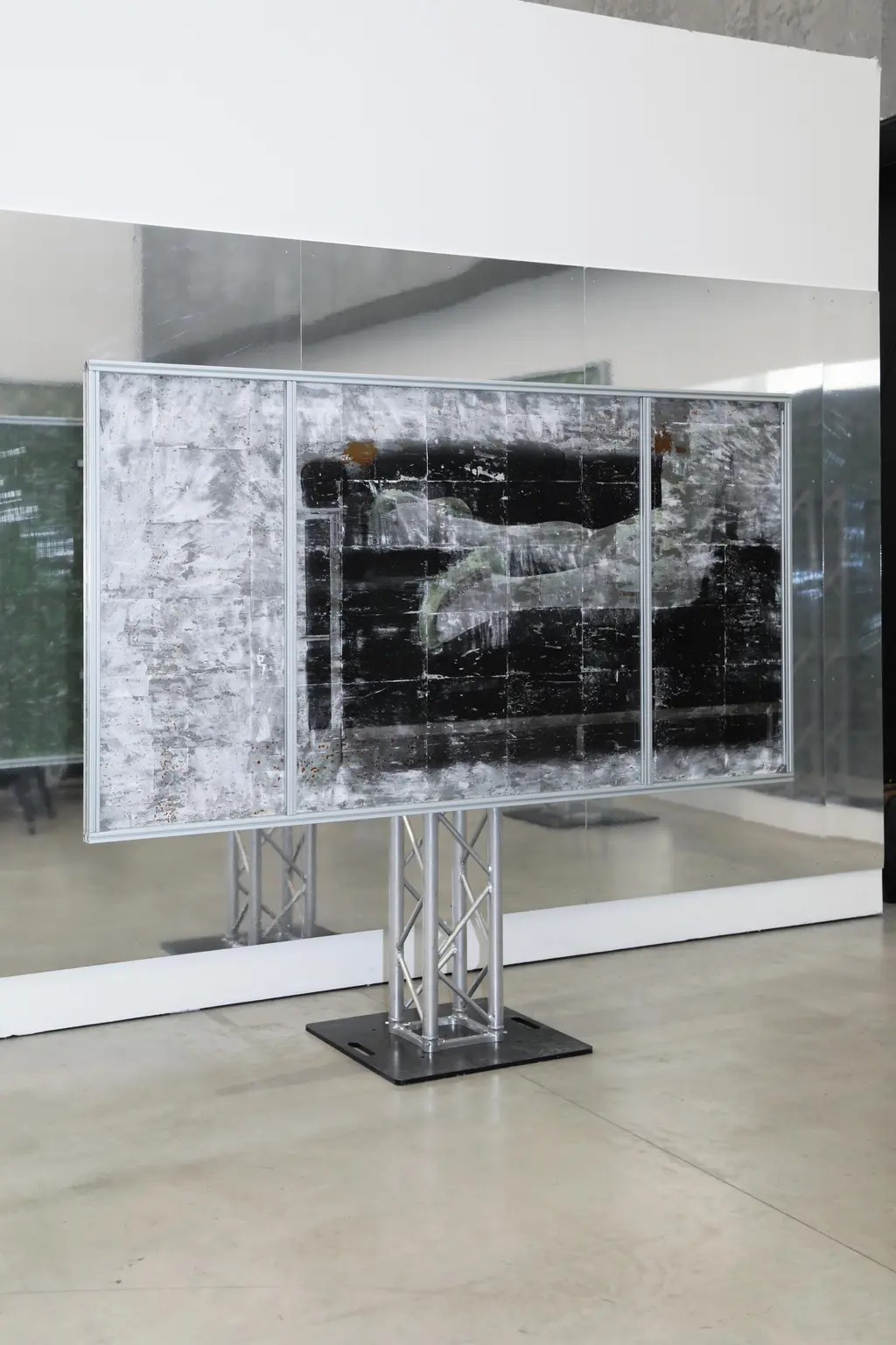 “I like that the image is becoming very abstract and kind of decomposing itself,” says James, who was heavily inspired by fading remnants of larger-than-life street advertisements for the exhibition. The show ends with a reflective wall, allowing for an interactive space for visitors to be reminded that they are currently being perceived, too. The exhibition explores themes of identity, which James has long been obsessed with.
