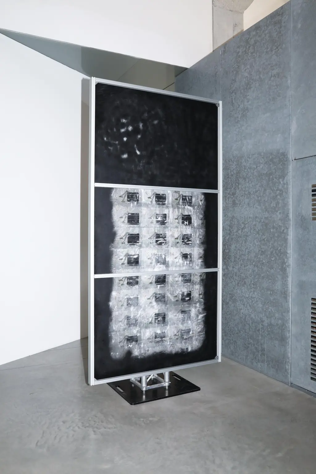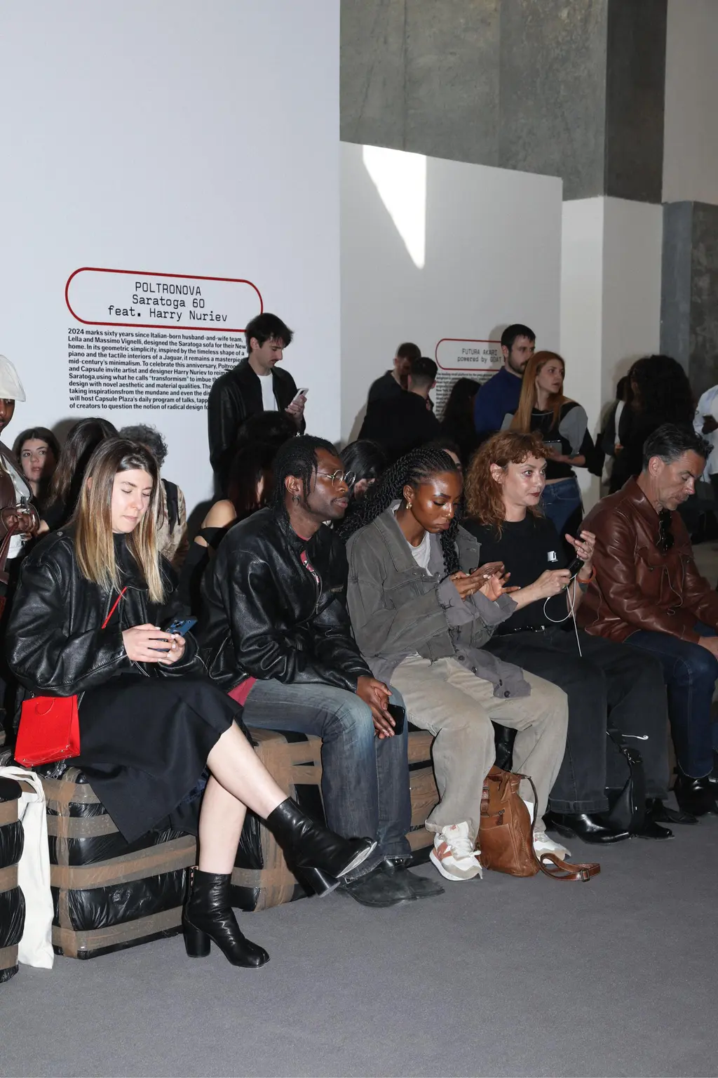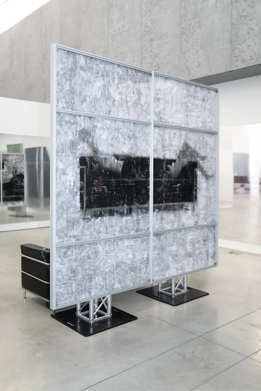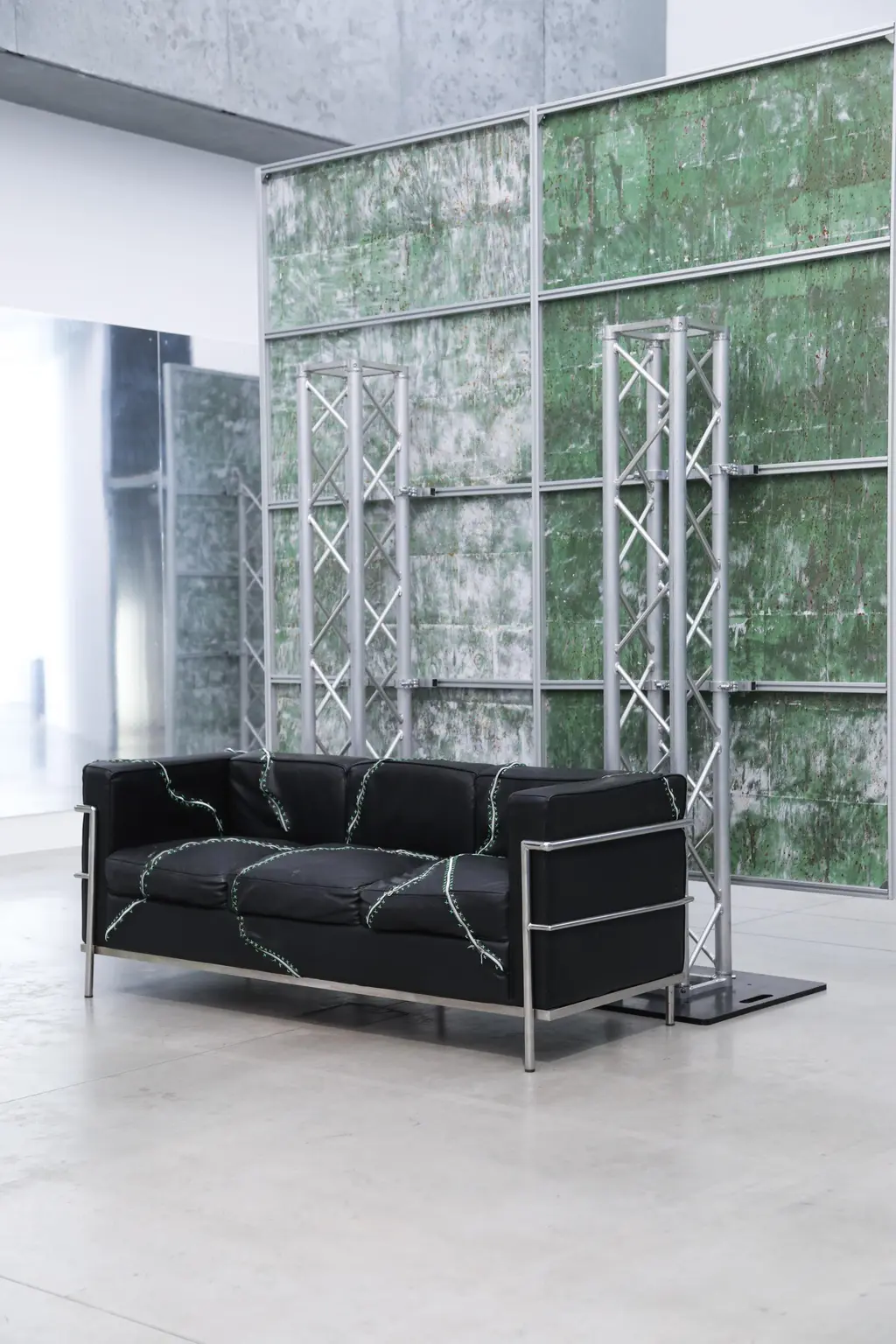 “When we started to [collaborate], one of the main things that sparked my attention was that there was the opportunity to have a billboard in the city,” he says. This billboard, which is up in all its glory in the Porta Venezia area of Milan, replicates one of James’ pieces in the exhibition: a metalwork sculpture featuring a combination of mannequin and human legs intertwined on a sofa, against a backdrop of textured steel panels.