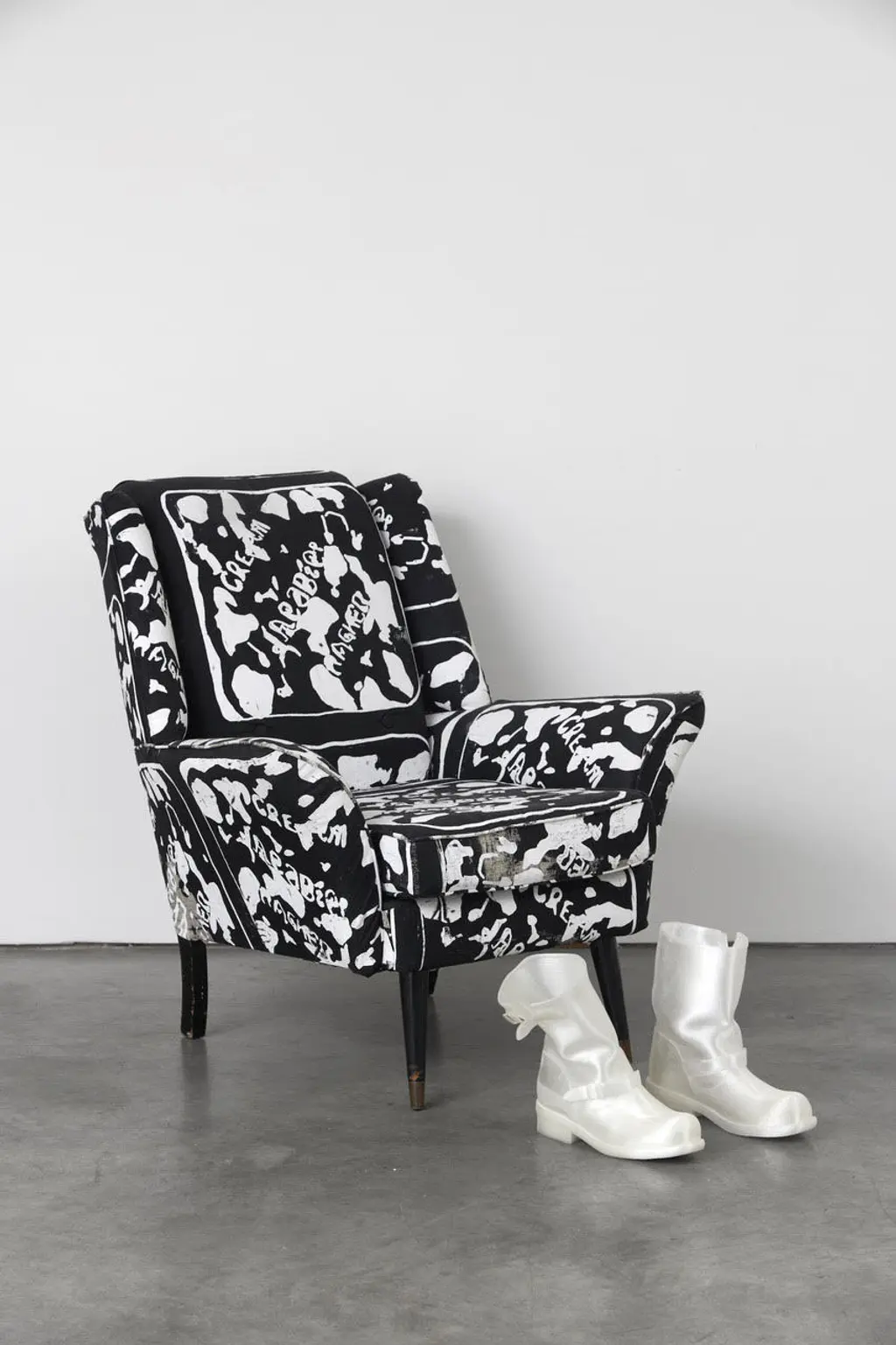 Cream Crackered, hand screen printed arm linen armchair, 2019
