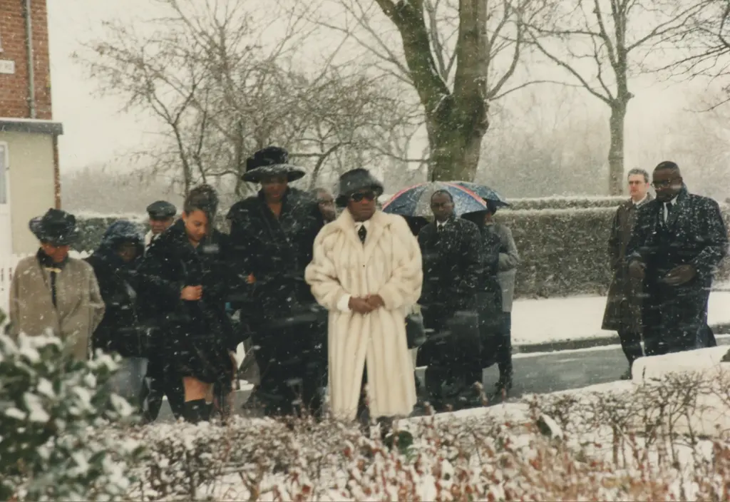 As a love letter to Black British culture in the North of England, Lambert’s celebratory series presents the “power of individuality but also the beauty of community”. Groups of his relatives stand outside a church, by a buffet or walking through the snow in extravagant fur coats, top hats and slick two-piece suits.