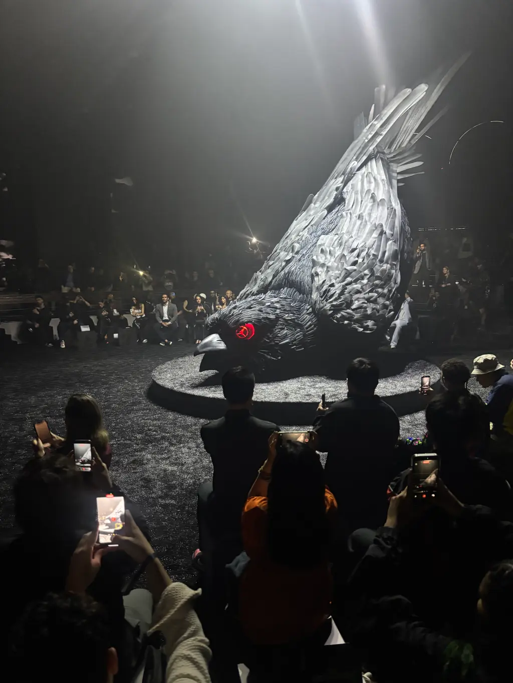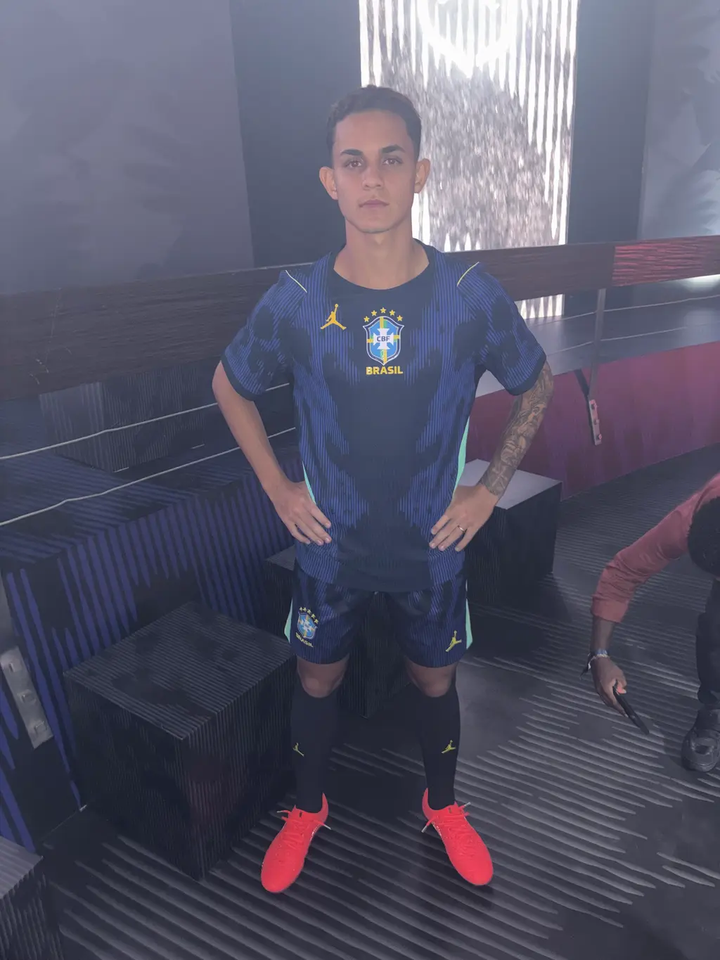 Hopping off the bus, the bass-thumping, bone-rattling music seeped out of the red-lit venue, Estádio Sinistro. Inside, a large sculpture of a raven sat at the centre, its blackened pupils emblazoned with the Jumpman logo. A red screen counted down the final seconds, then a montage of players appeared. After a few words from Mensah, the celebration turned up a notch as dancers moved fluidly to Brazilian trap, and out stepped Ronaldinho (I know him!) in the kit, greeted by a room full of cheers.