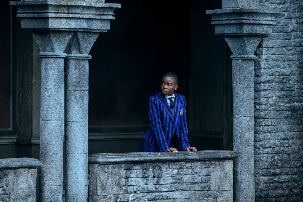 Sounds about right. But the same can’t be said for Sunday’s character. Bianca Barclay is the queen bee at Wednesday’s new school, Nevermore Academy. Which, by teen TV show standards, means that she’s also the plot’s obligatory bitch. But of course, she’s not any old popular mean girl. Since this is a school for outcasts and misfits, Bianca also happens to be a siren (meaning she’s drawn to water), illustrated by Sunday’s icy blue contacts and sometimes-scaly skin.