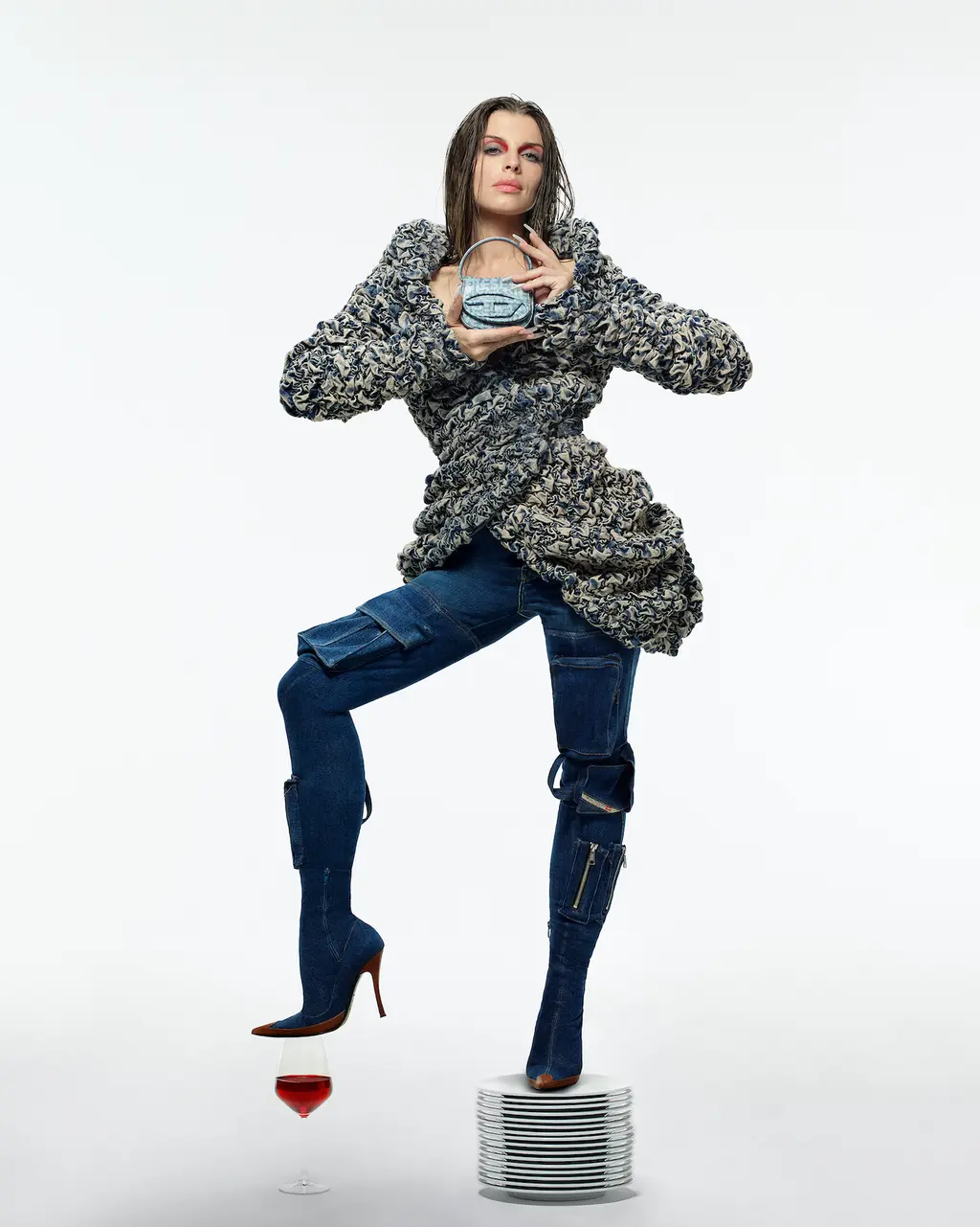 Julia wears top, leggings, gloves, shoes and bag DIESEL