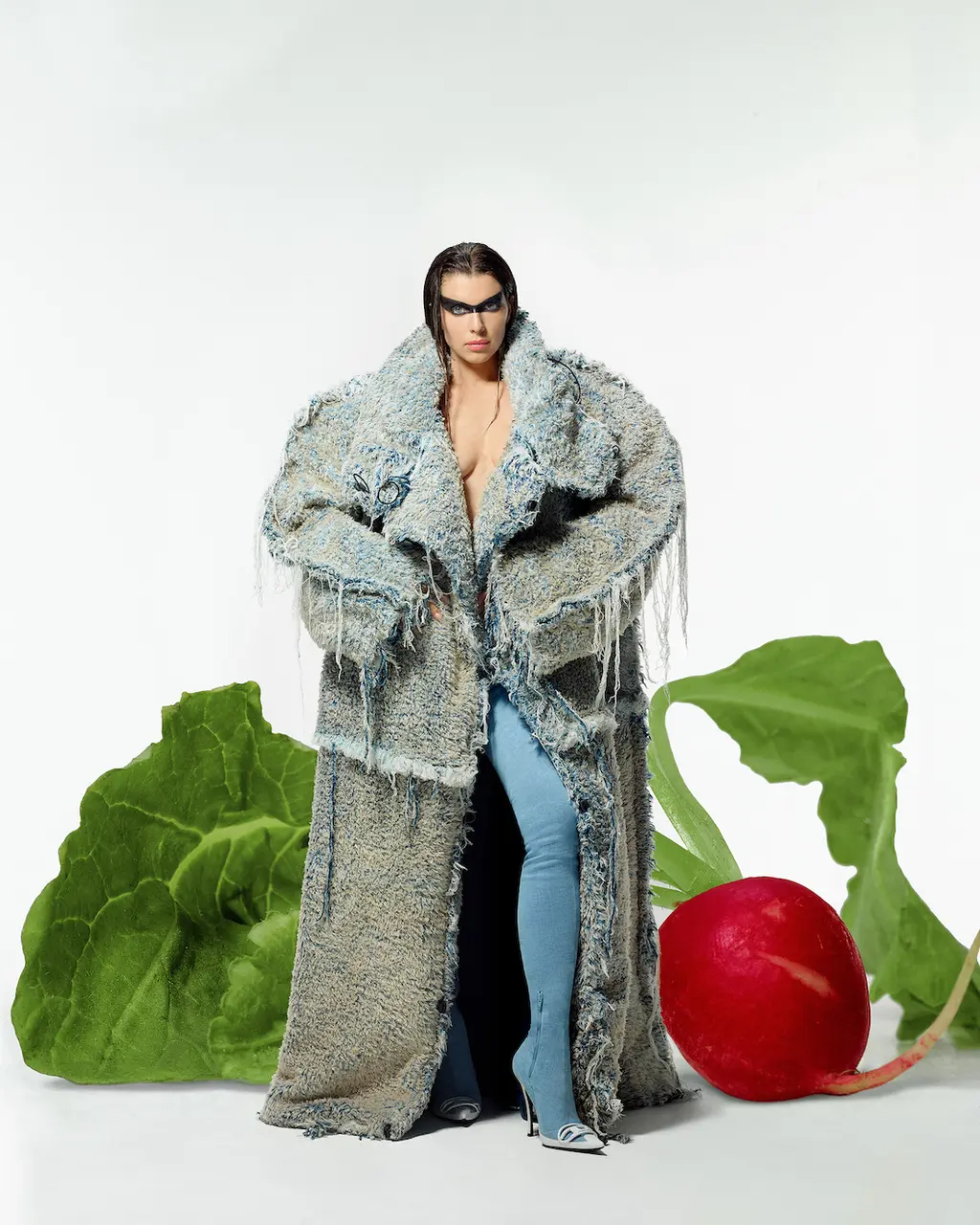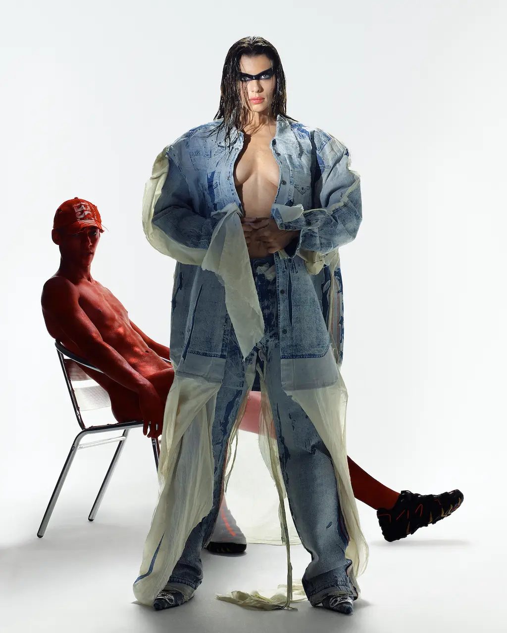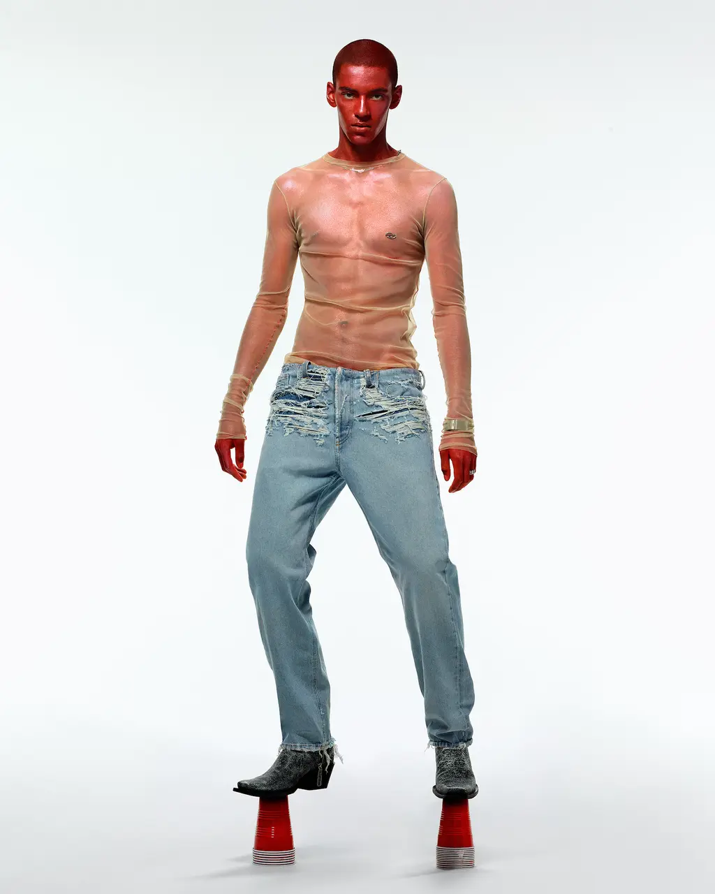 Alban wears top, trousers, shoes, necklace, bracelet and ring DIESEL
