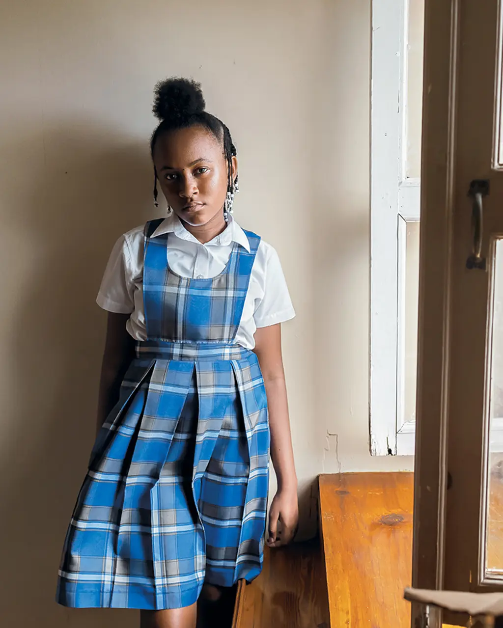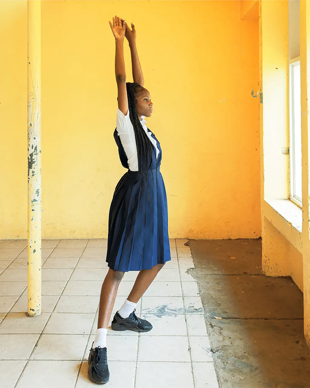 Two thousand miles from the Gotham rat race, Jeffers found himself in his old, now abandoned primary school building. “I thought a project on [uniforms] could, in some way, give the young people a vision of themselves in magazines and books,” says the 31-year-old. “That’s something that growing up I never really had”