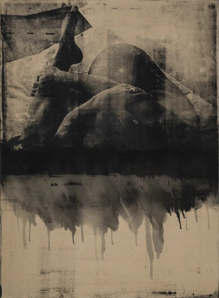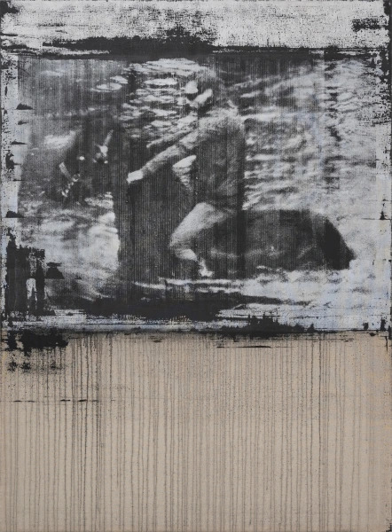 Take Blue Roan (2015), a large screen print of a man at Appleby Horse Fair, wearing sunglasses, riding a horse through a body of water so deep it laps at his feet, soaking his shoes. Printed onto a piece of raw linen, the acrylic print crackles and drips around the edges; an analogue TV sputtering to life.
