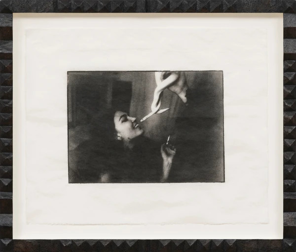 In another work, Lifer (2020 – 25), a woman beams affectionately at a small snake being held by a floating hand. As it pushes its head towards her teeth, she tilts her head back in the shadowy room while a cigarette in her left hand burns.