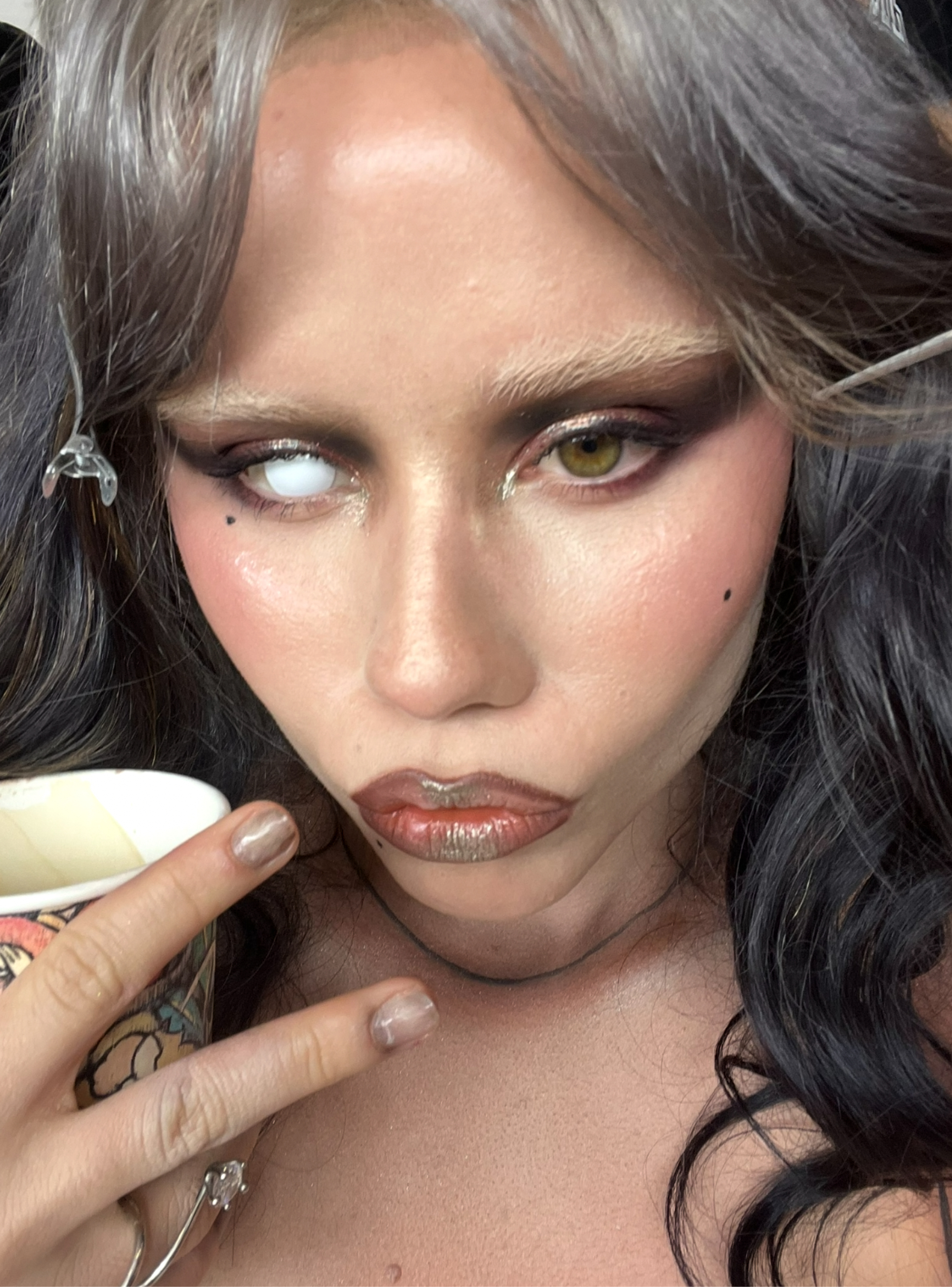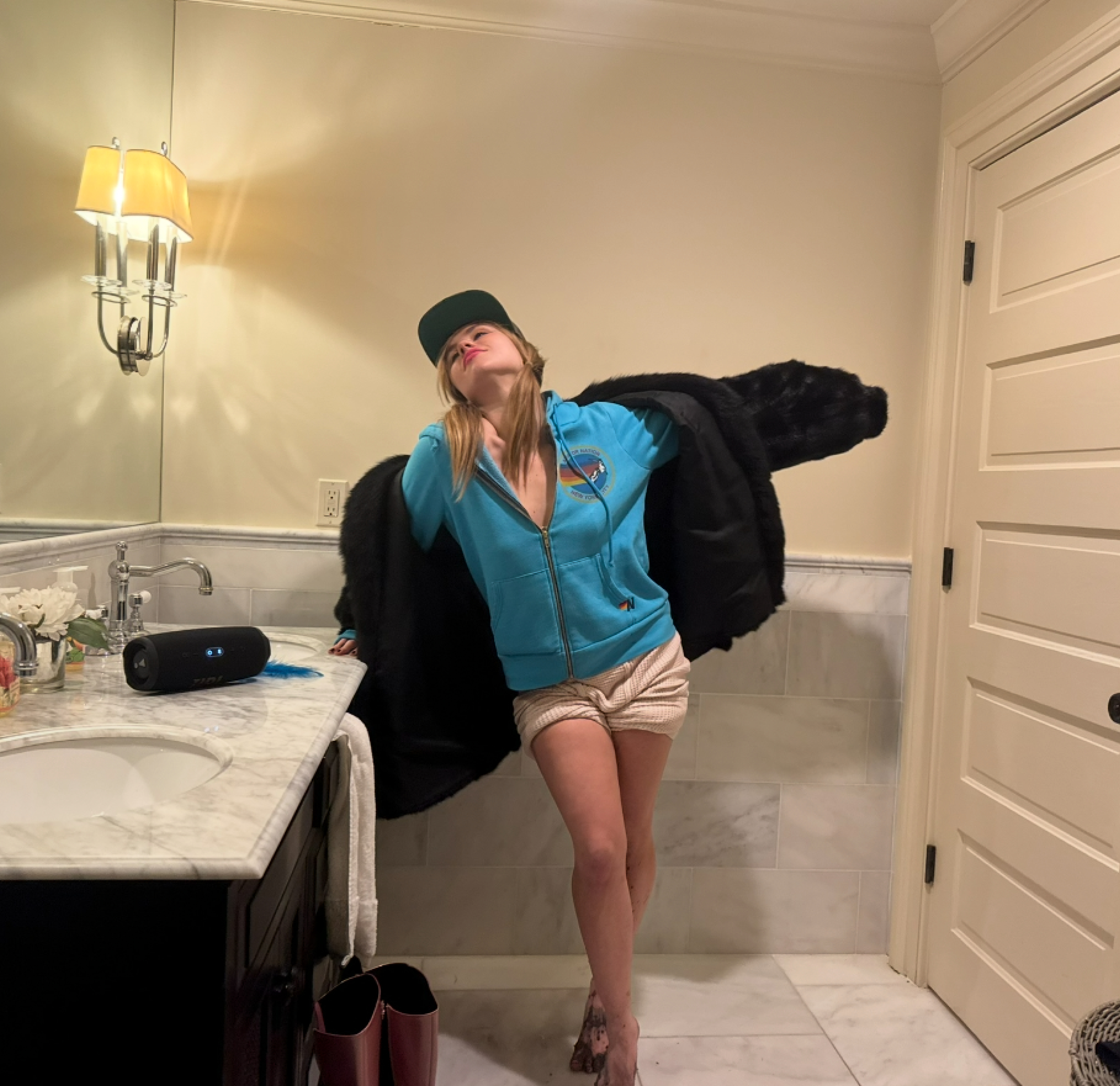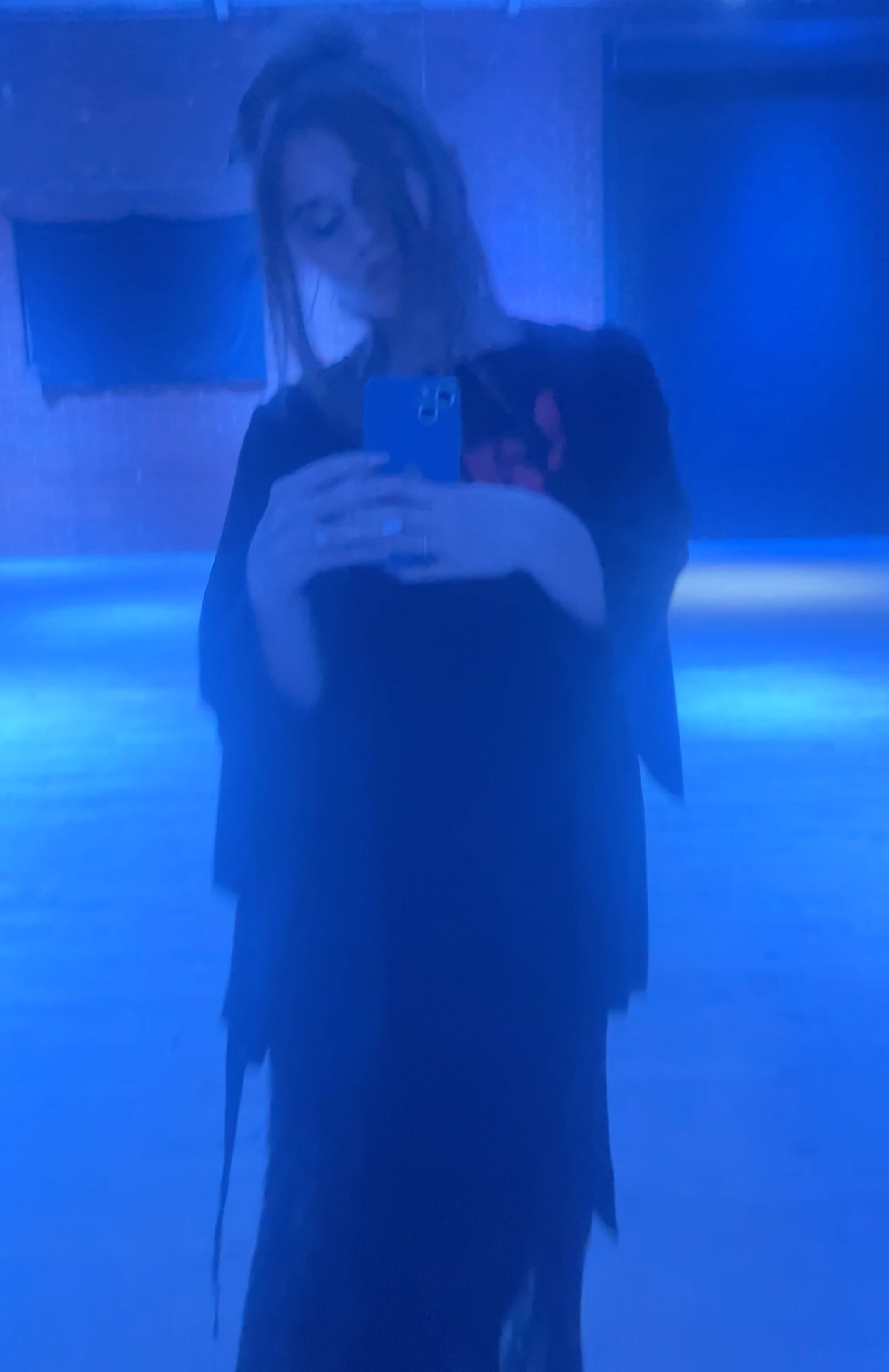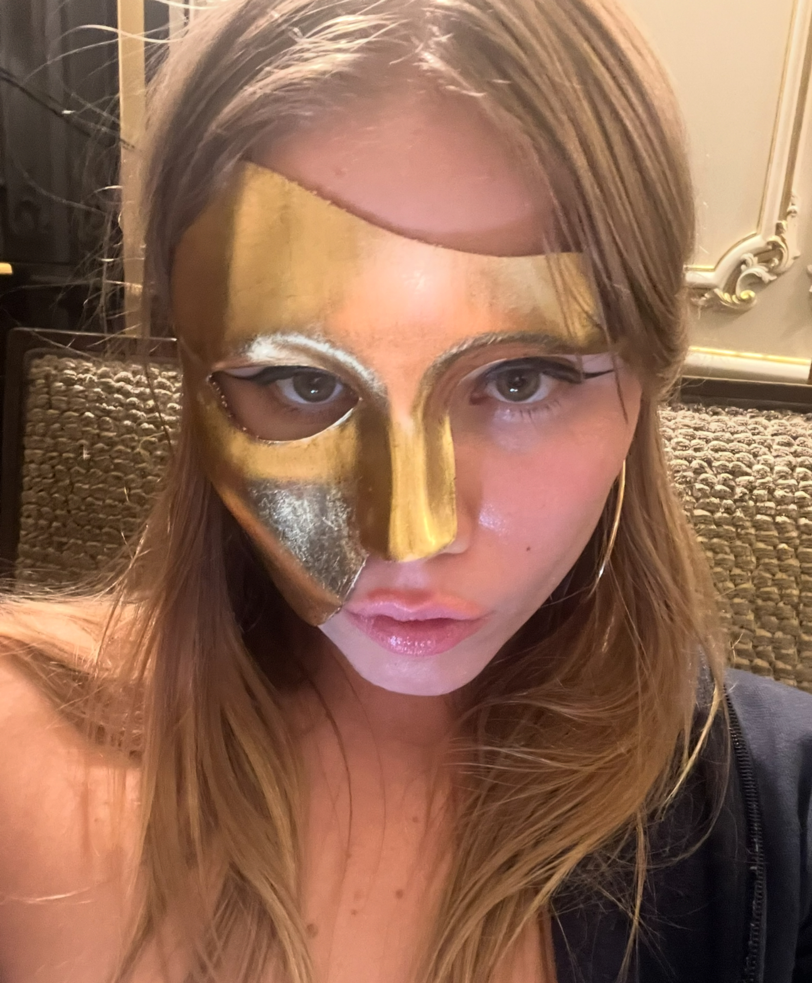 “I get an intuitive hit of, “Oh, I wanna post this,” you know? I posted this [black and white] photo of myself at a party that my friend took on film. This guy sitting next to me had on my cowboy hat and I scratched his face out [of the photo] ’cause I didn’t like him, not even platonically. I was kind of using him as a prop, but I thought it would stir up a little question, like: “Who’s the mystery man?” I posted it and then I was like: “Oh my God, I am a freak and my crushes probably think I’m crazy.” But some part of me wanted to share that and be silly. TikTok, though, I really don’t know how to navigate.”