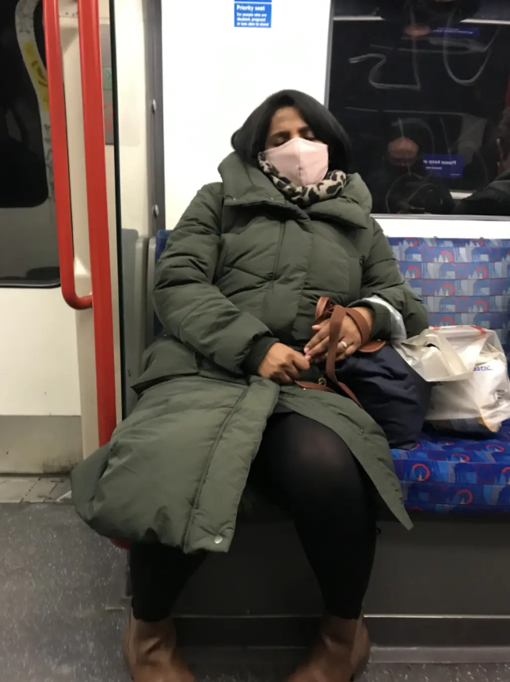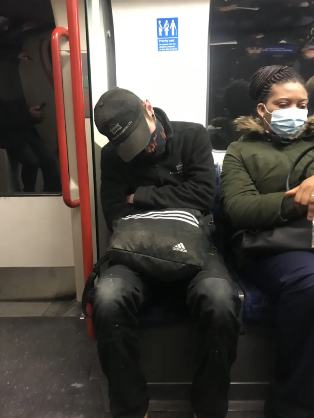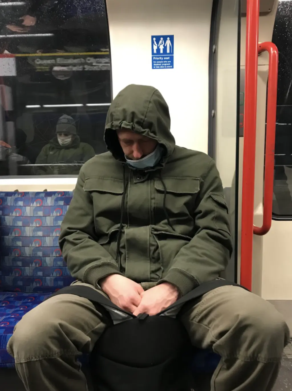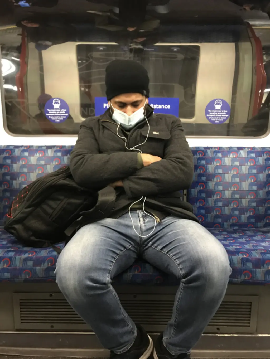 Over six months, starting in winter last year, Carter captured countless sleepers everyday, the rate only slowing once restrictions began to lift and the tube gradually got busier. Akin to his profession, Carter also found it was “mainly builders” occupying the tube over lockdowns, with masks generally “well worn”. “It would be quite unusual to see someone without one, particularly at the peak of lockdown when you’d really stand out,” he says.