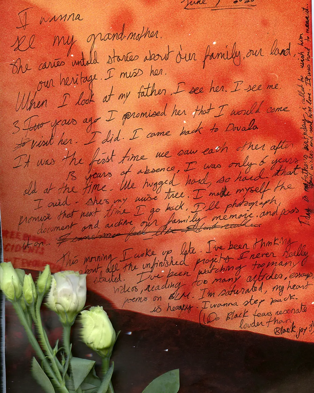 Lowe experienced a further emotional shift when her father, who is of the Bamileke people, the largest ethnic group in Cameroon, showed her two childhood photographs that were taken in the style of the African studio photography she had been studying. It was this physical connection to history that inspired her to return to Cameroon to conduct research into her family’s photographic archives and, in turn, learn more of the Bamileke history.