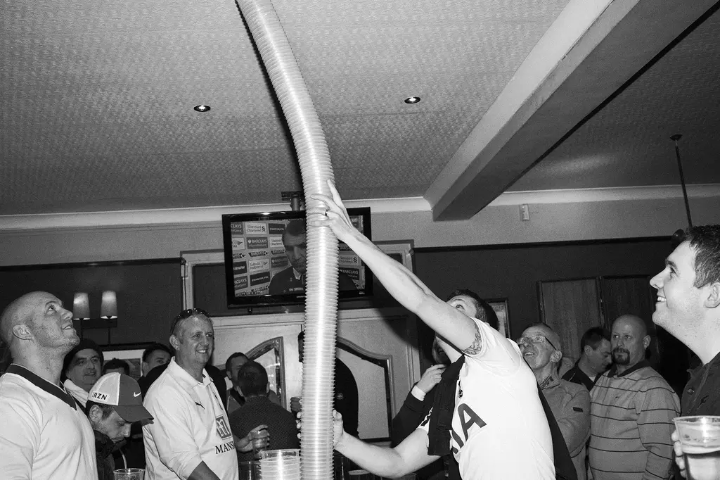 “The image on the right was shot in The Torch, a pub close to Wembley, some hours before our League Cup final against Chelsea in 2015. This guy started collecting all the plastic cups and put one cup inside the other creating this giant pole of beer plastic cups. Together the images suggest a play on male testosterone.”
