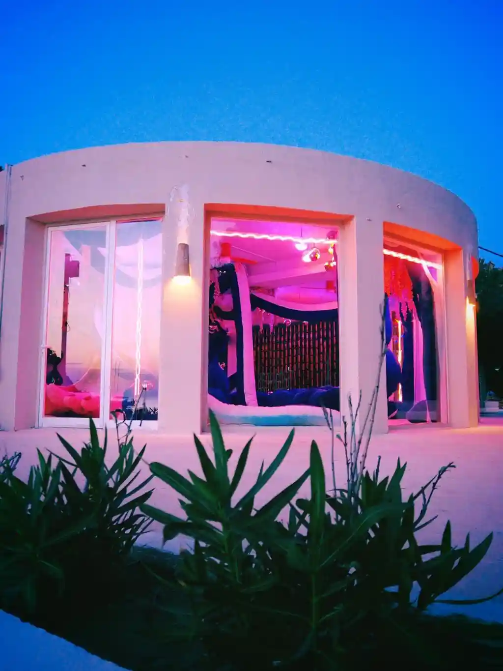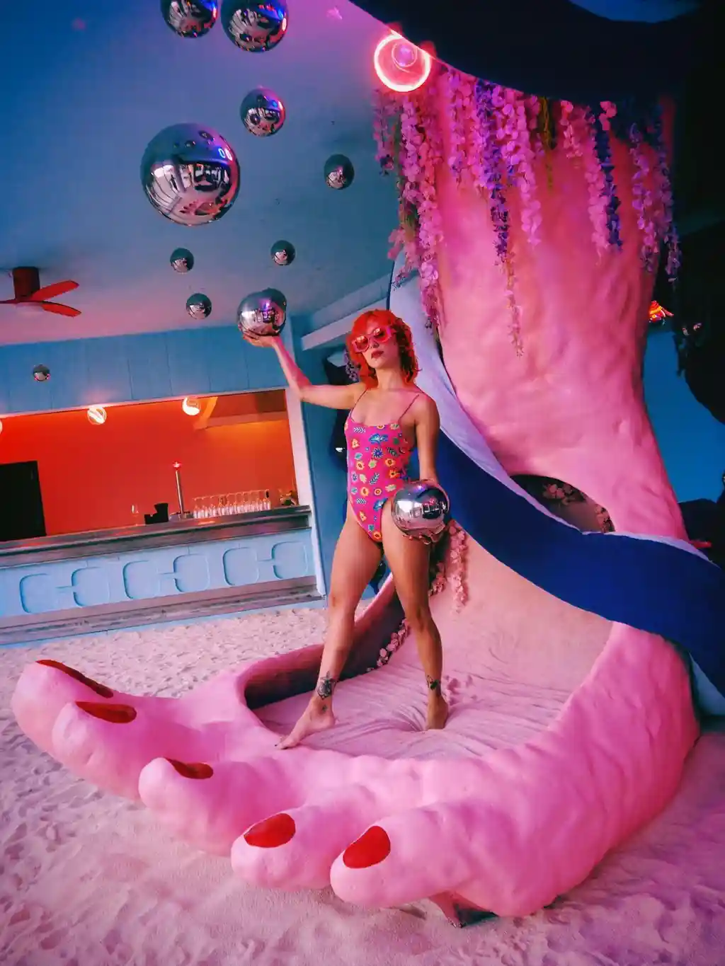 So with a killer location in the bag, it was time to design the beach house’s accompanying space. Enter Makaroff, who went to town with her larger-than-life, surrealist sculptures of giant pink feet, chrome balls hanging from the ceiling and makeshift octopus tentacles doubling up as bean bags; a deep sea dream in a room with huge windows overlooking the beach.