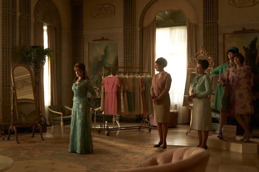 Two photographs of the couple inspired the moodboard: an early one featuring Priscilla in a lavender blouse and a rather risque for the time midriff-baring resort look. As did a stack of vintage publications. “I looked at a lot of magazines from 1959 to 1975 and pulled out references from adverts,” Battat explained, noting the move towards brazen, rather than secret, hair-dyeing during the ‘70s.