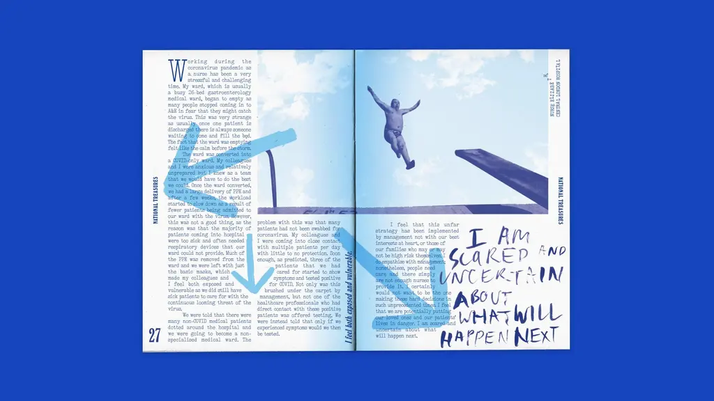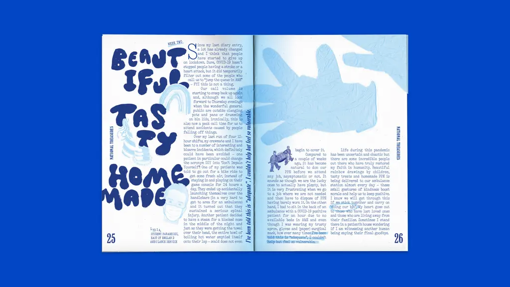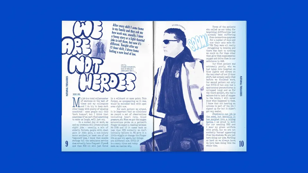 To pay tribute to the sacrifices made by NHS workers, contemporary British culture magazine Between Borders has created National Treasures – a zine which expresses the reality of the frontline through moving journal entries from charge nurses, student paramedics, and hospital cleaners (to name a few).