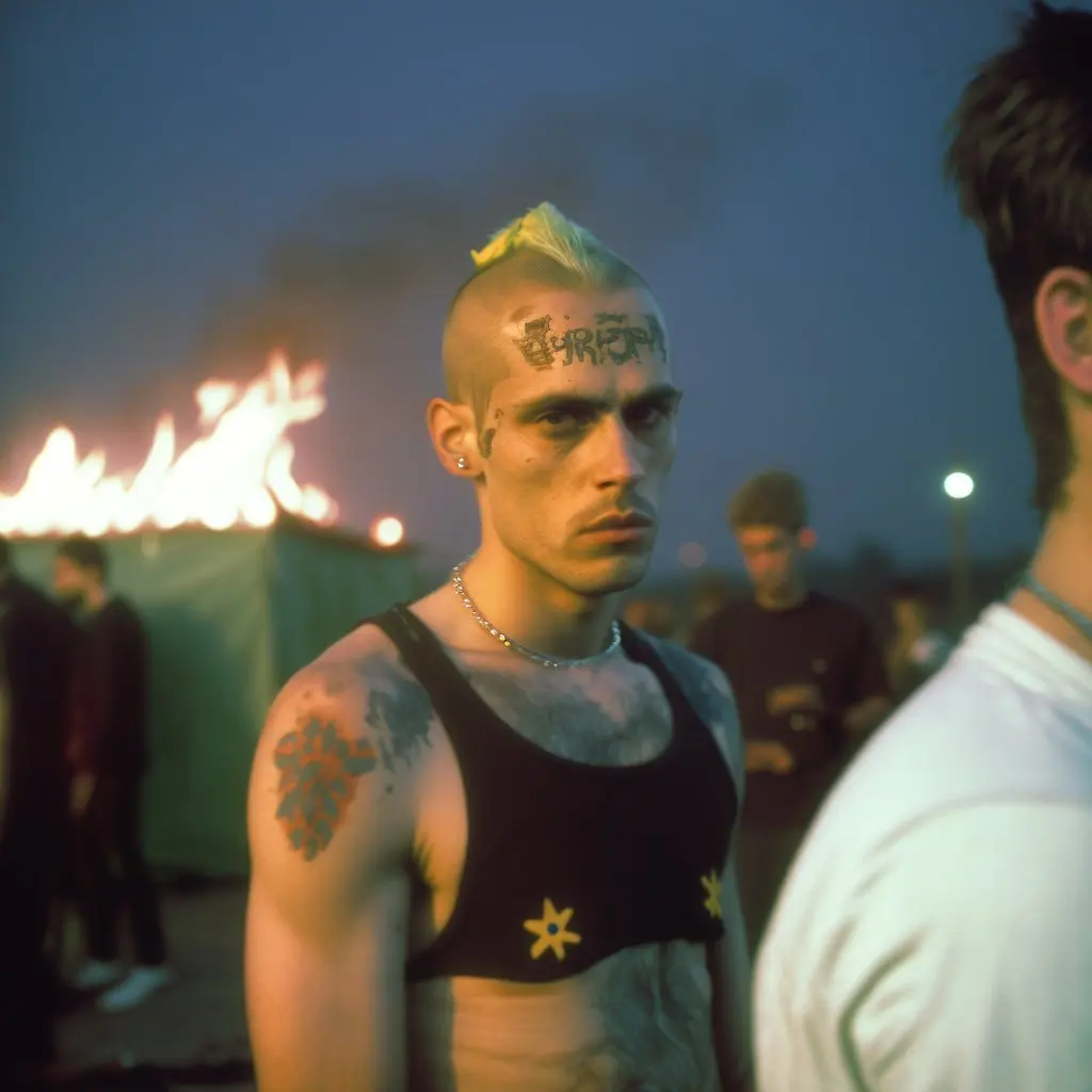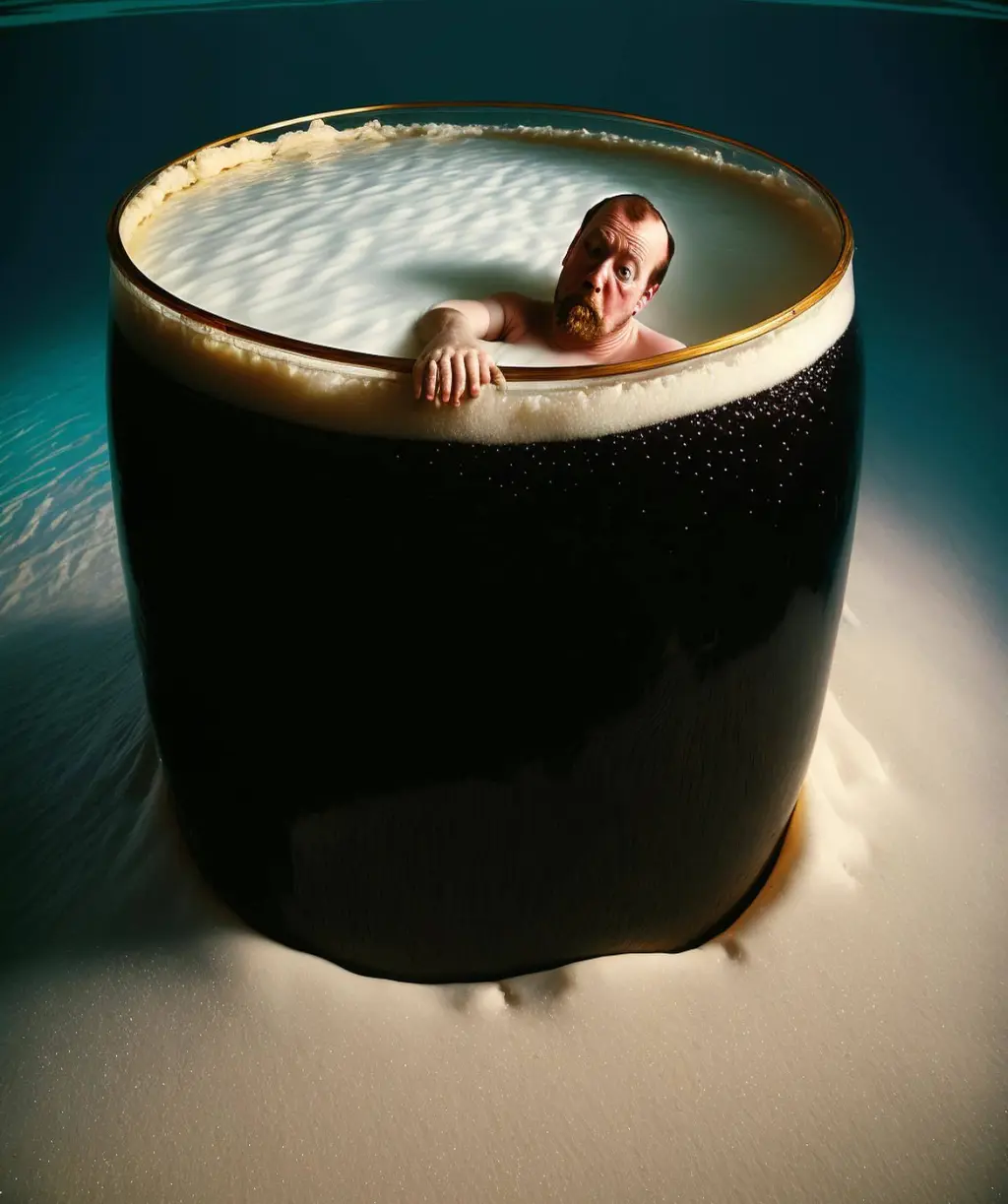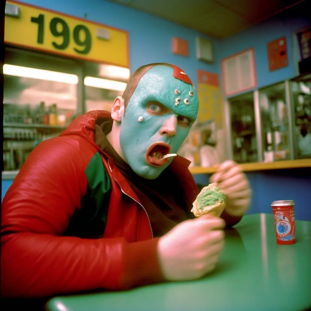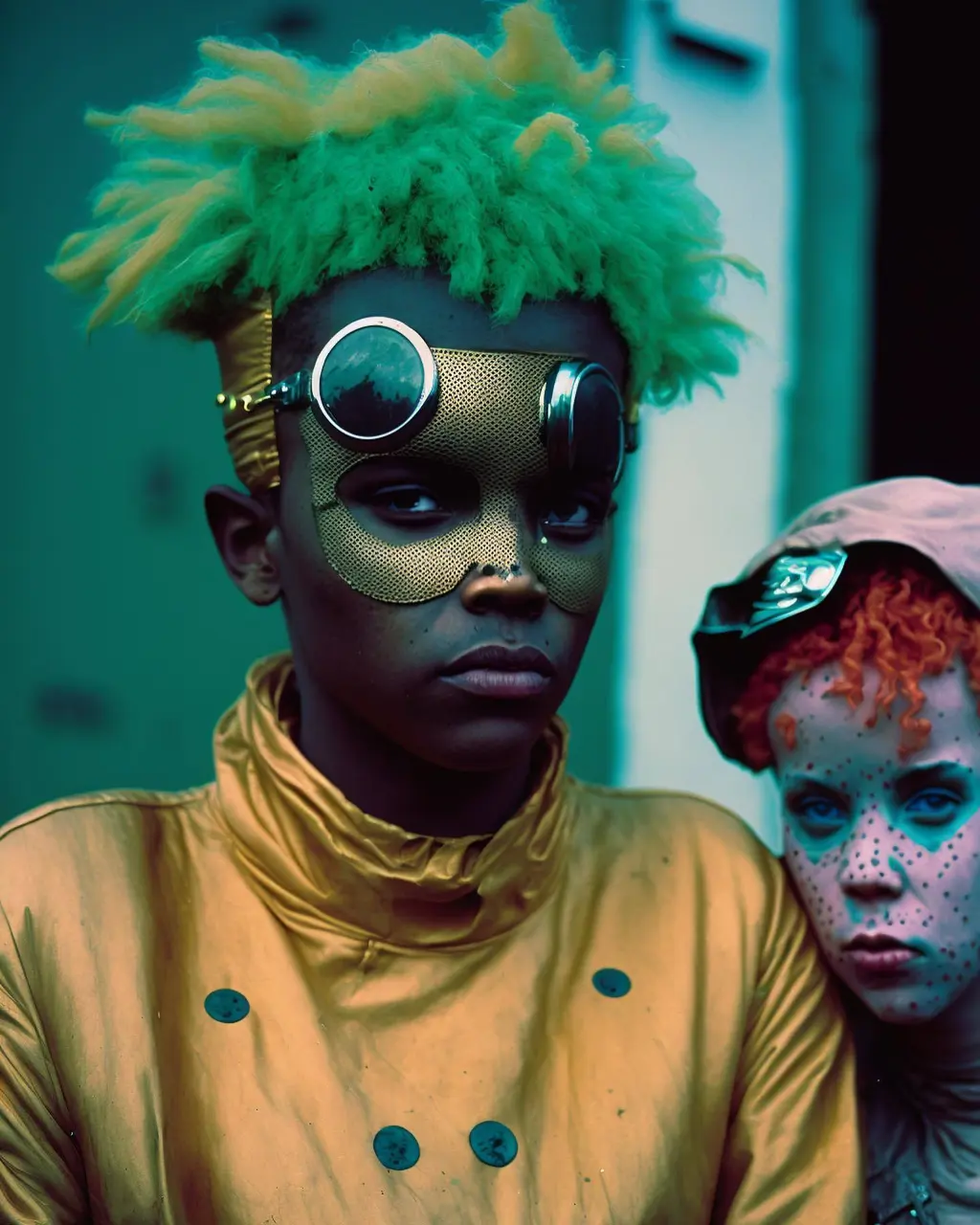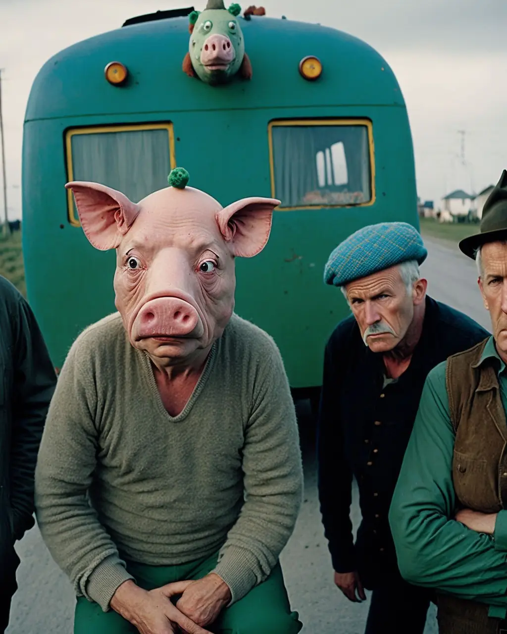 In a medley of deep green and blue hues, Mulhern’s characters run the gamut from monstrous pigs to men bathing in giant pints of Guinness, in a universe that looks like a cross between Blade Runner, a riotous free party and Mad Max: Fury Road. Each image looks slightly off-key in a way that hyperrealistic AI imagery often does (35 fingers, 47 teeth, that kind of thing), but for Mulhern’s purposes, it fits the bill. These pseudo-humans might have piercing stares, but they’re not supposed to look too real. Rather, this is a space for him to have a laugh, take the piss and even exorcise some demons.