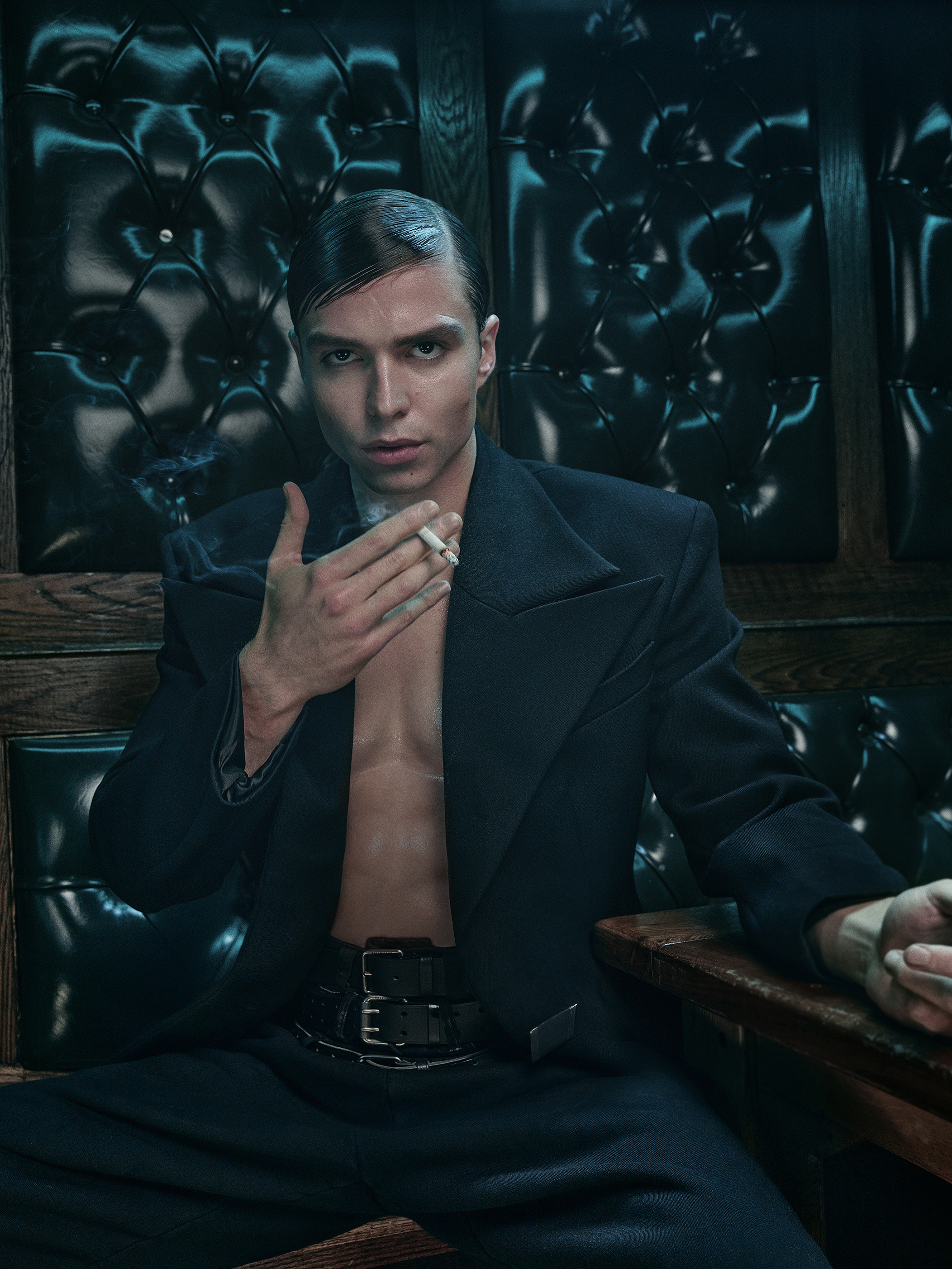 “People have always said I have a dark side,” he acknowledges. “As an actor, I’ve gone through so many phases of self. I’m still evolving. It feels like every few months, a new version of me dies and is born. But I suppose that’s just part of being human. My only aspiration is to work with the greatest artists of our time.” He pauses, sparks that lighter and stares at the flame. “We only get one life.”