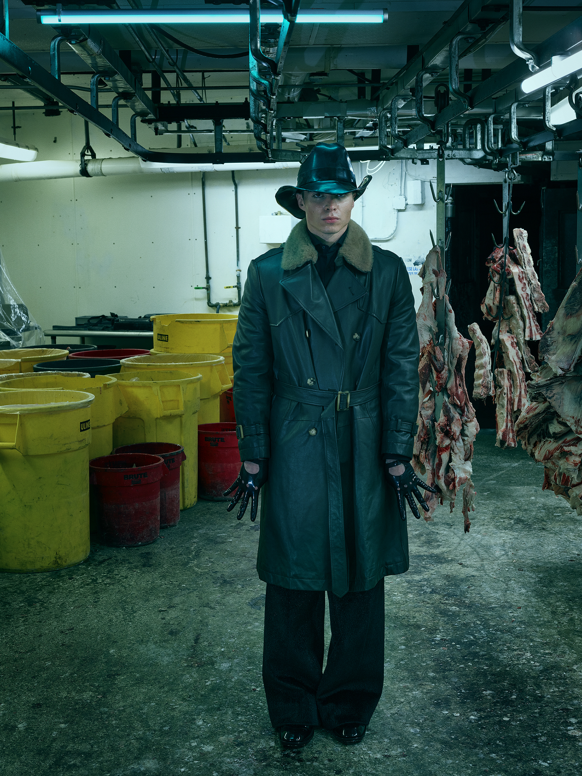 Jacket, shirt, trousers, tie and shoes SAINT LAURENT BY ANTHONY VACCARELLO, gloves HANDSOME STOCKHOLM and archive coat courtesy of Alias Costume