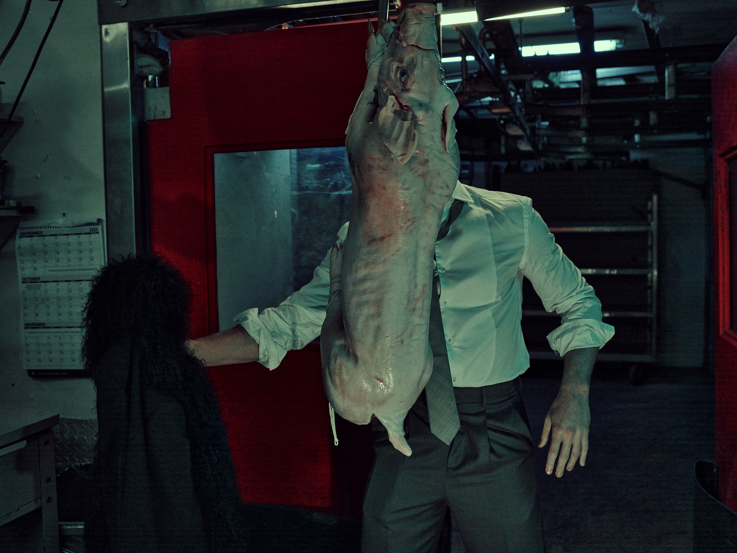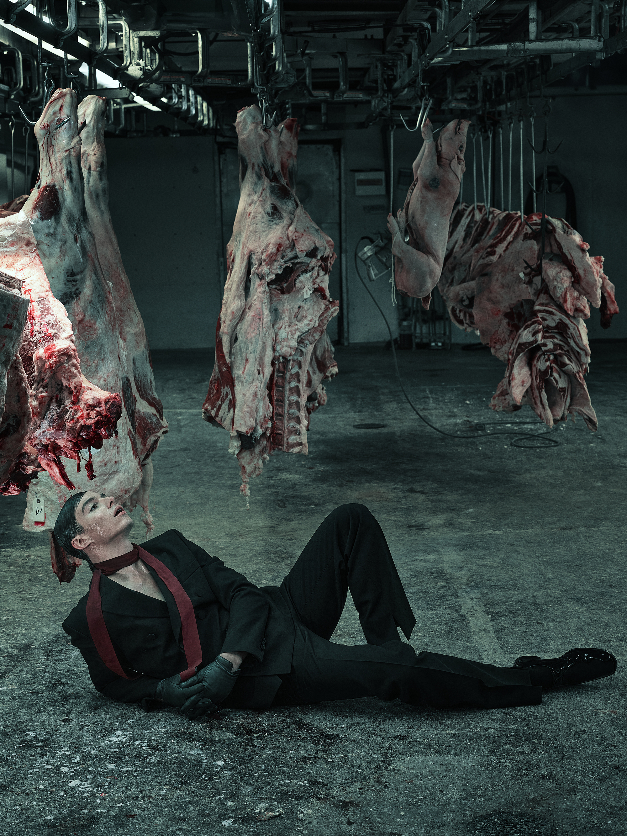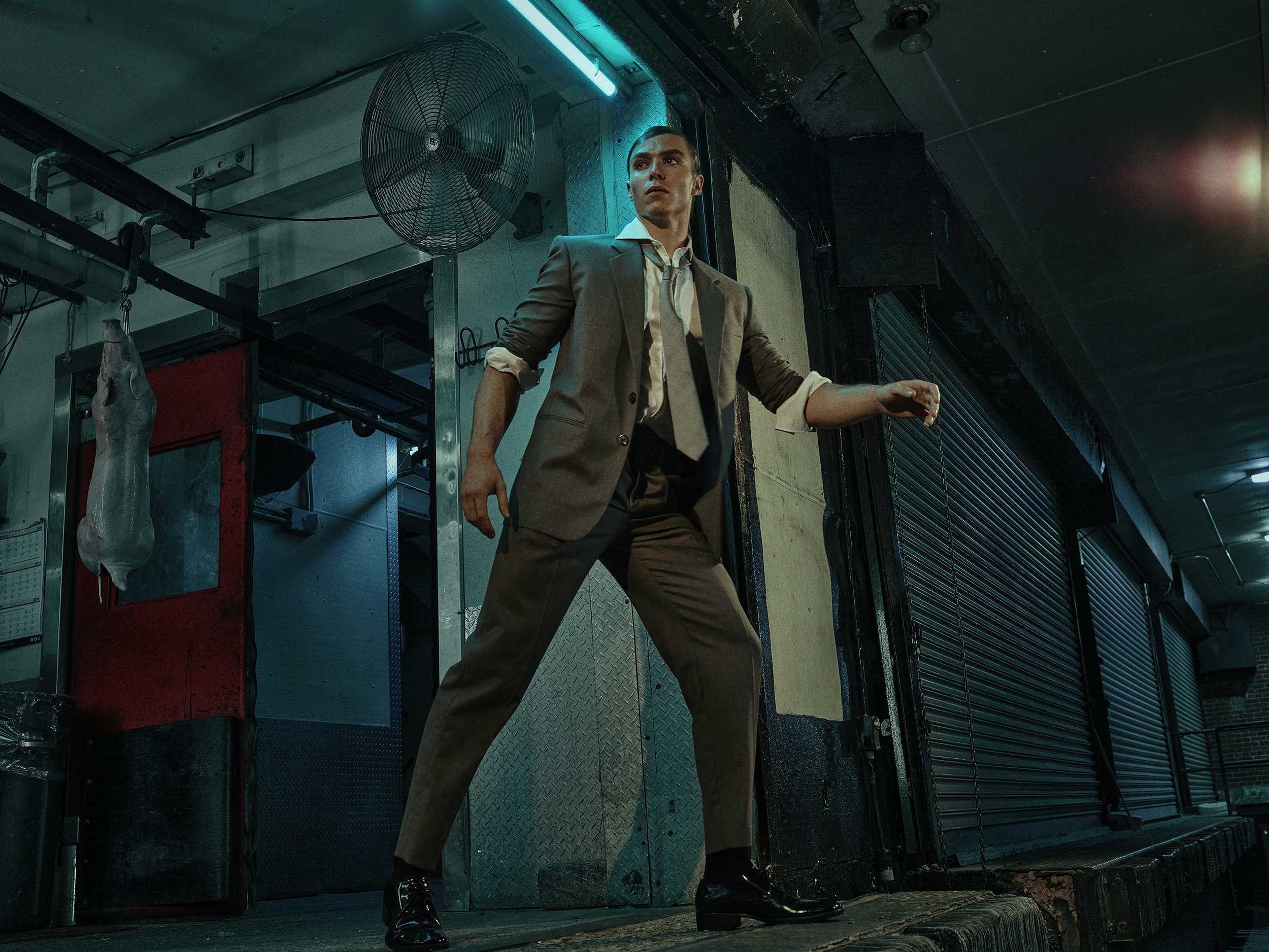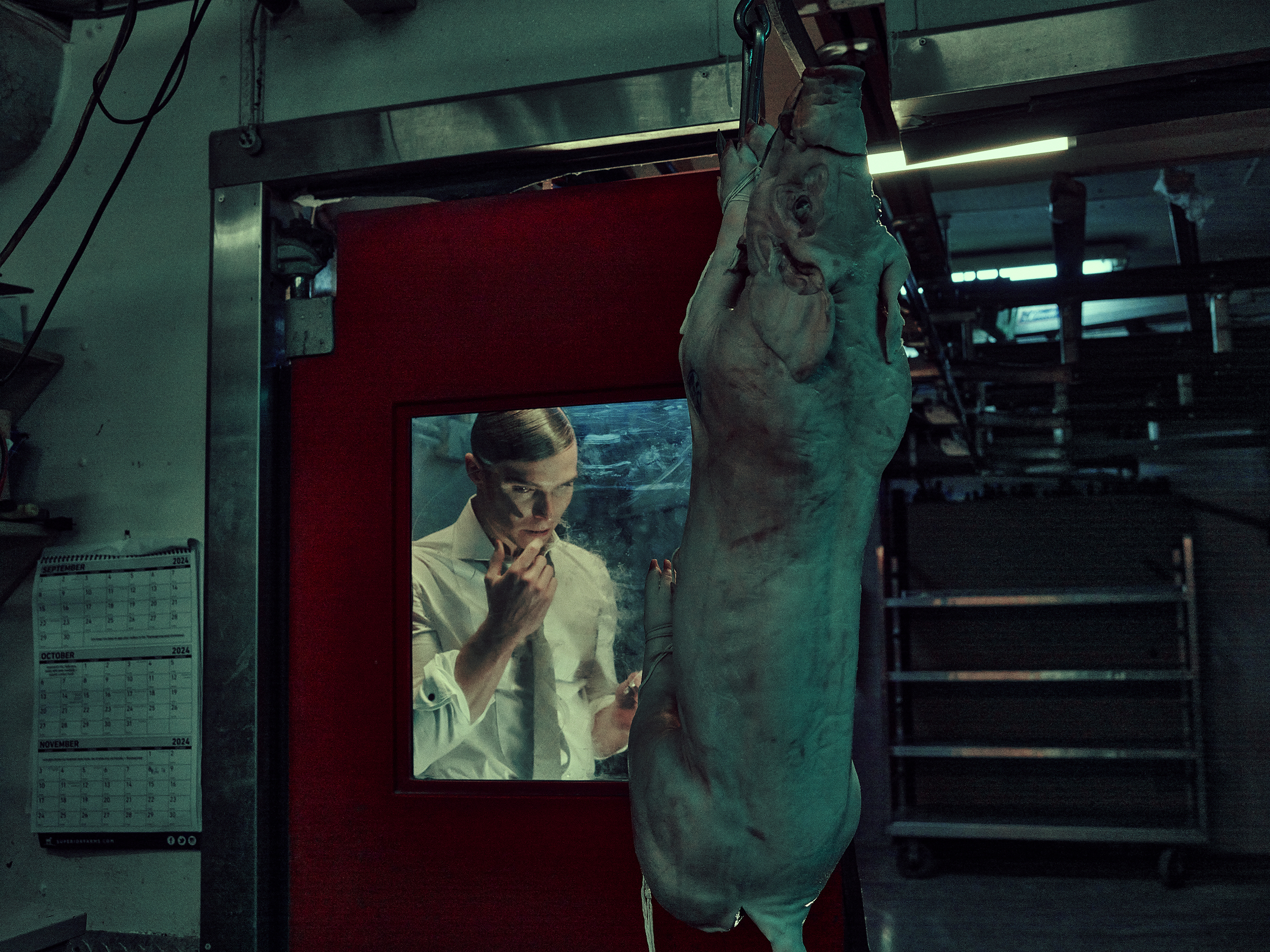 “Clothes really help with finding the character,” says Nicholas, embracing the FACE photography as if it were another on-camera role. Slowly, the sartorial vision crystallises – American Psycho, with Christian Bale as Patrick Bateman in the 2000 film: sleek, tailored, taut and replete with Saint Laurent precision. Perfect attire, then, for the location of the shoot: in the freezer units of the Meatpacking District. One passing worker pauses to squint at the chilling tableau: Nicholas, bare-chested in McQueen runway, standing next to a pig carcass swinging on a hook. “Is that one of the Menendez brothers?” she asks, eyes wide.