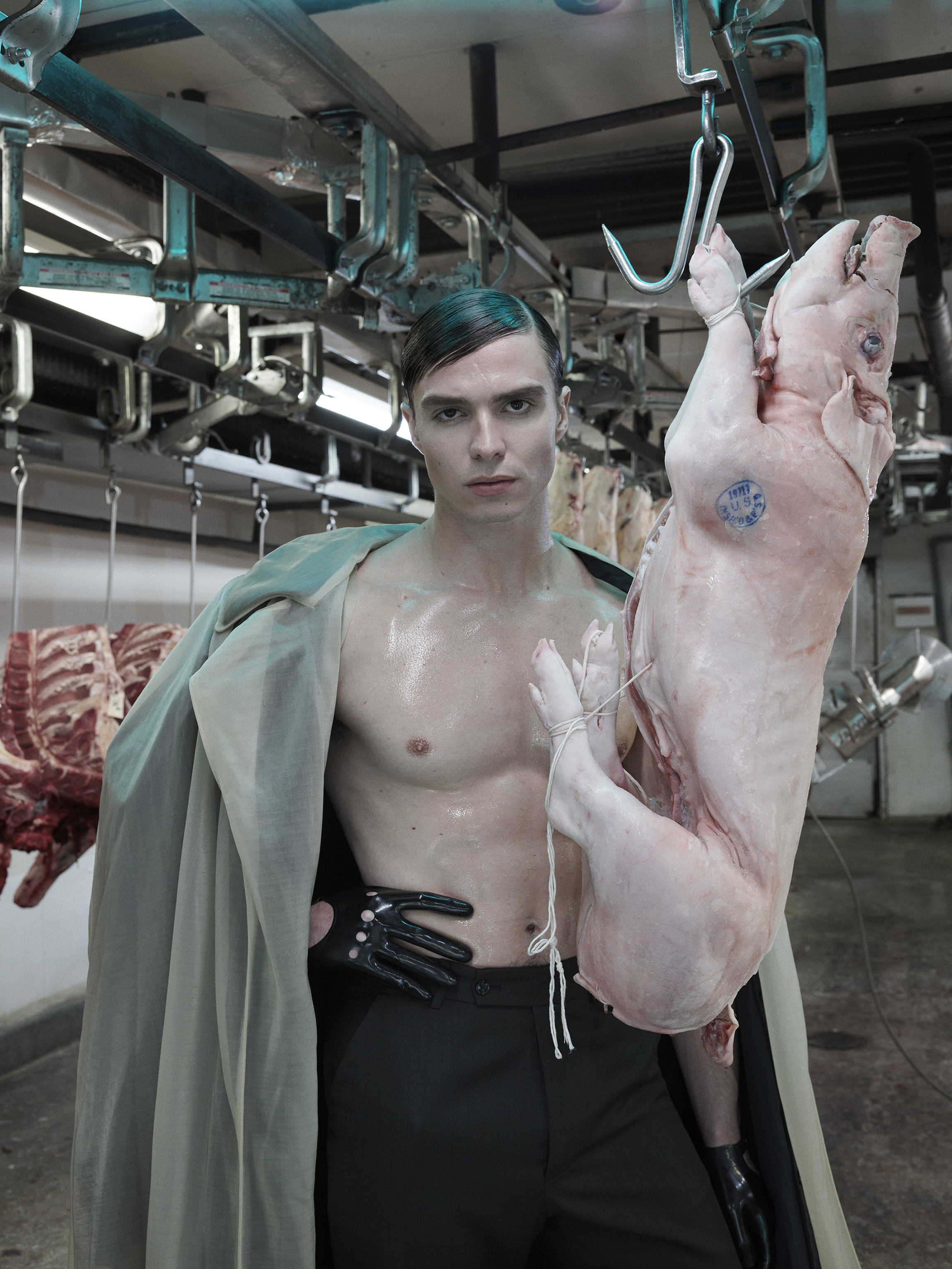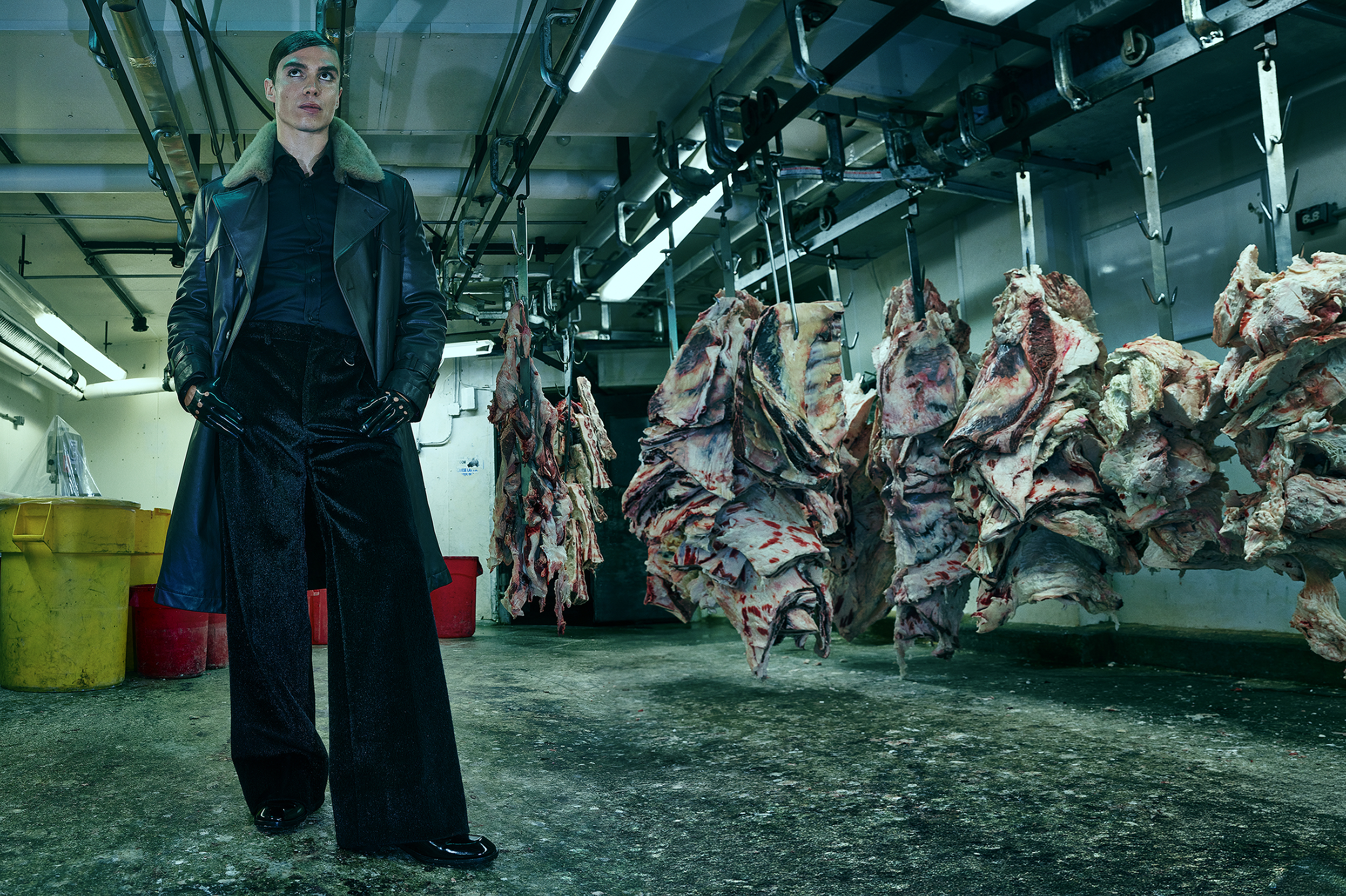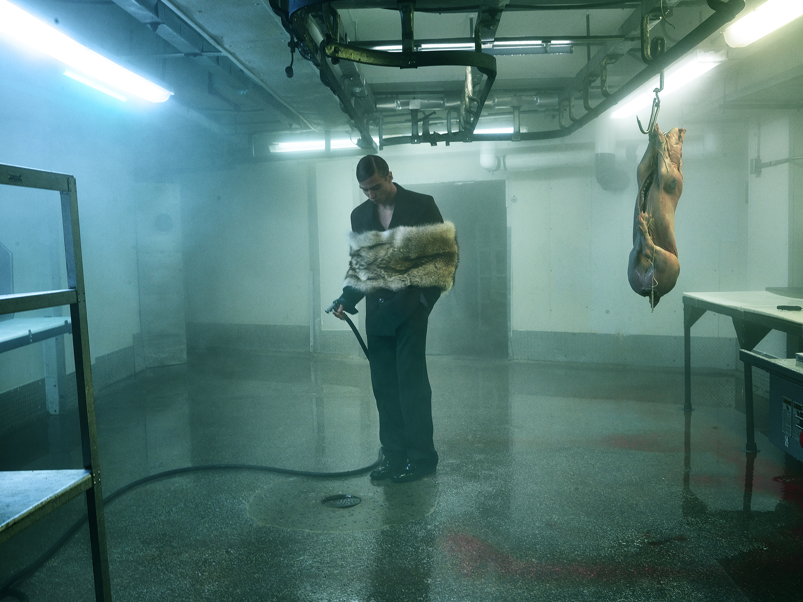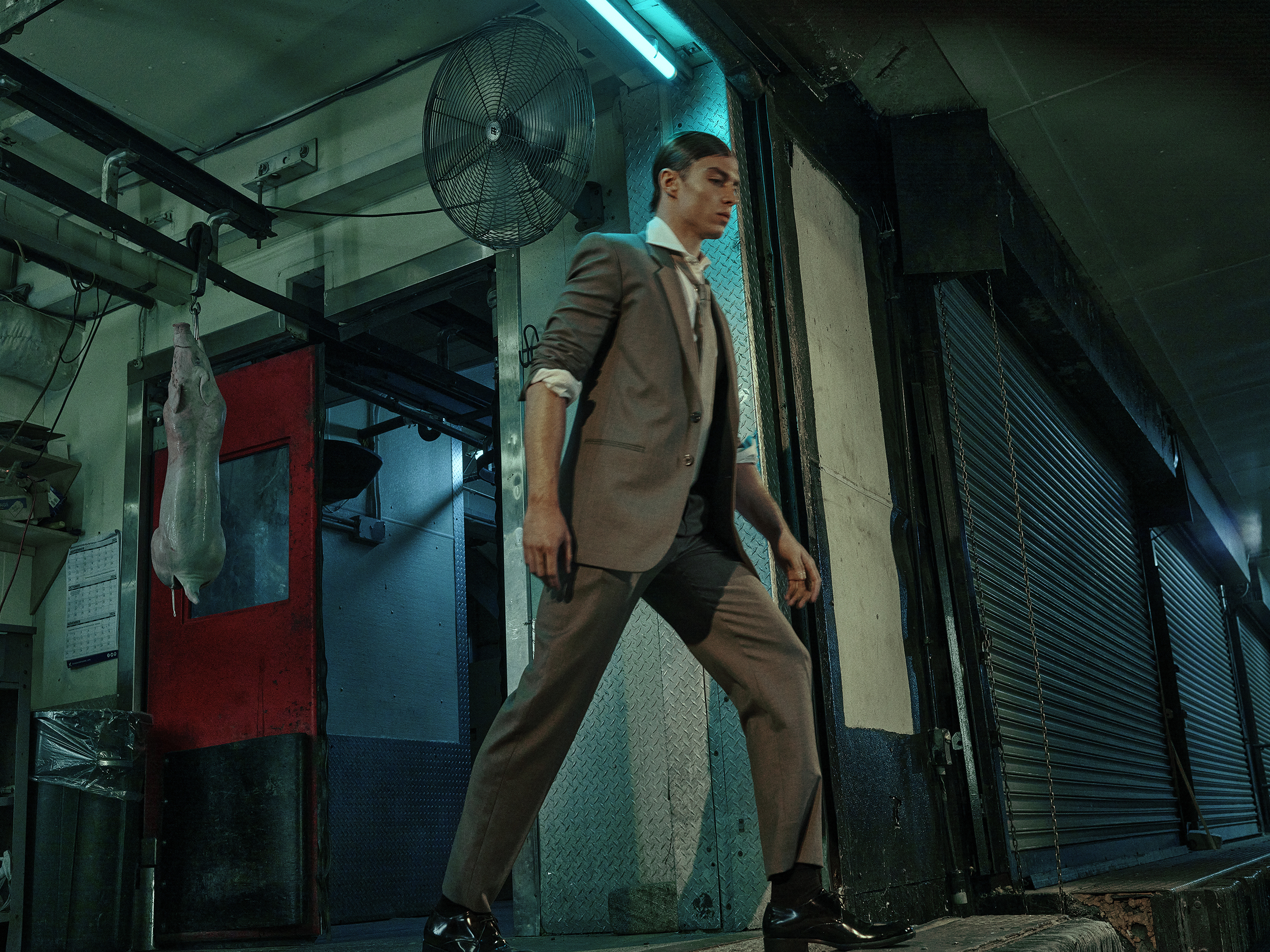 “Clothes really help with finding the character,” says Nicholas, embracing the FACE photography as if it were another on-camera role. Slowly, the sartorial vision crystallises – American Psycho, with Christian Bale as Patrick Bateman in the 2000 film: sleek, tailored, taut and replete with Saint Laurent precision. Perfect attire, then, for the location of the shoot: in the freezer units of the Meatpacking District. One passing worker pauses to squint at the chilling tableau: Nicholas, bare-chested in McQueen runway, standing next to a pig carcass swinging on a hook. “Is that one of the Menendez brothers?” she asks, eyes wide.