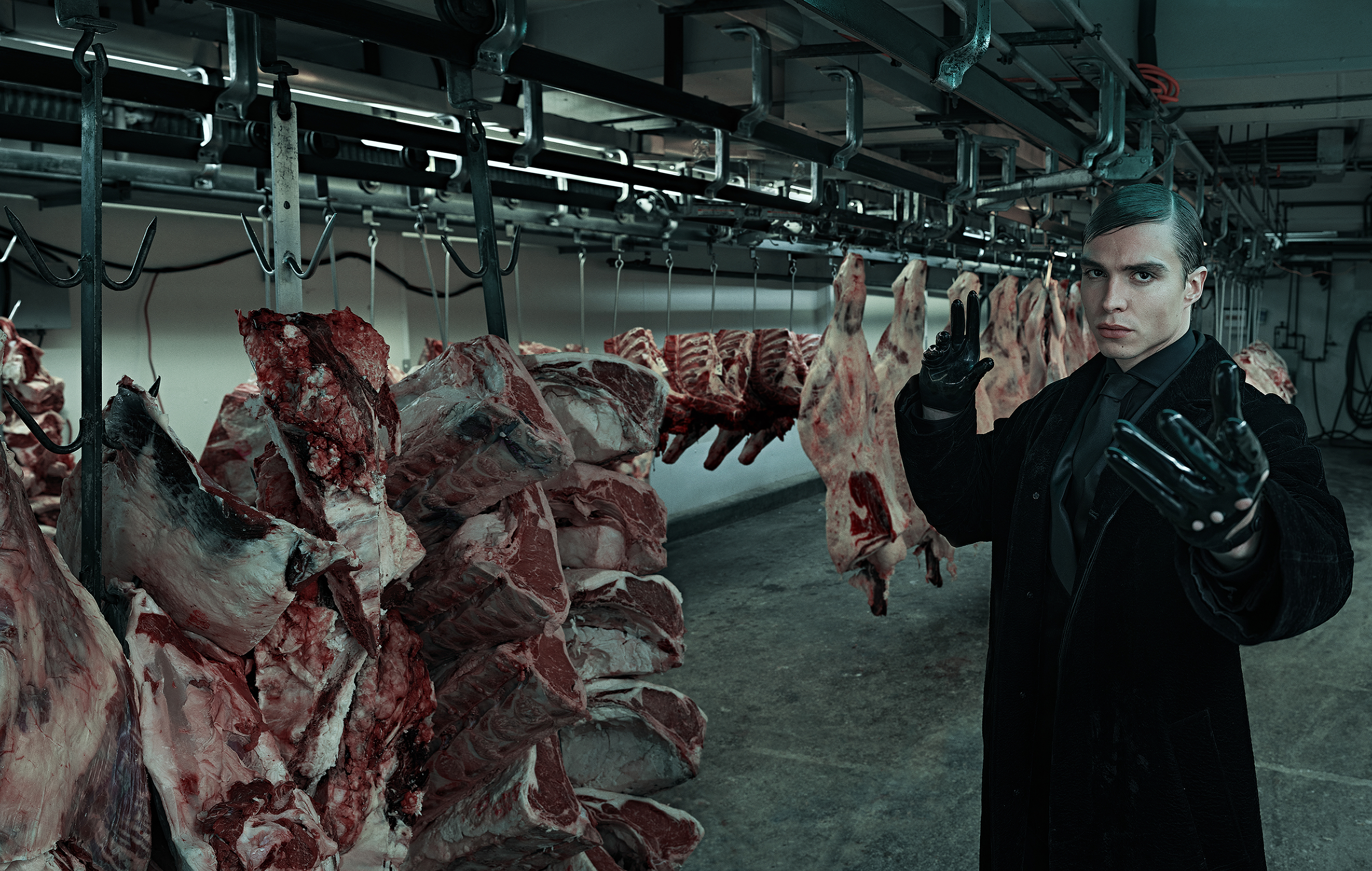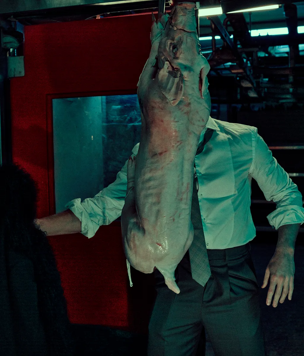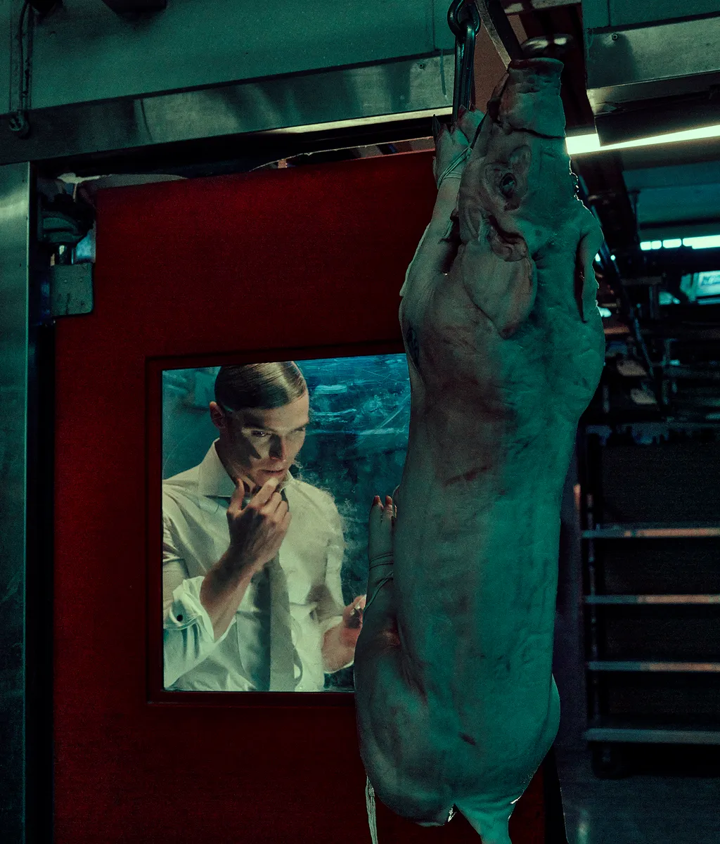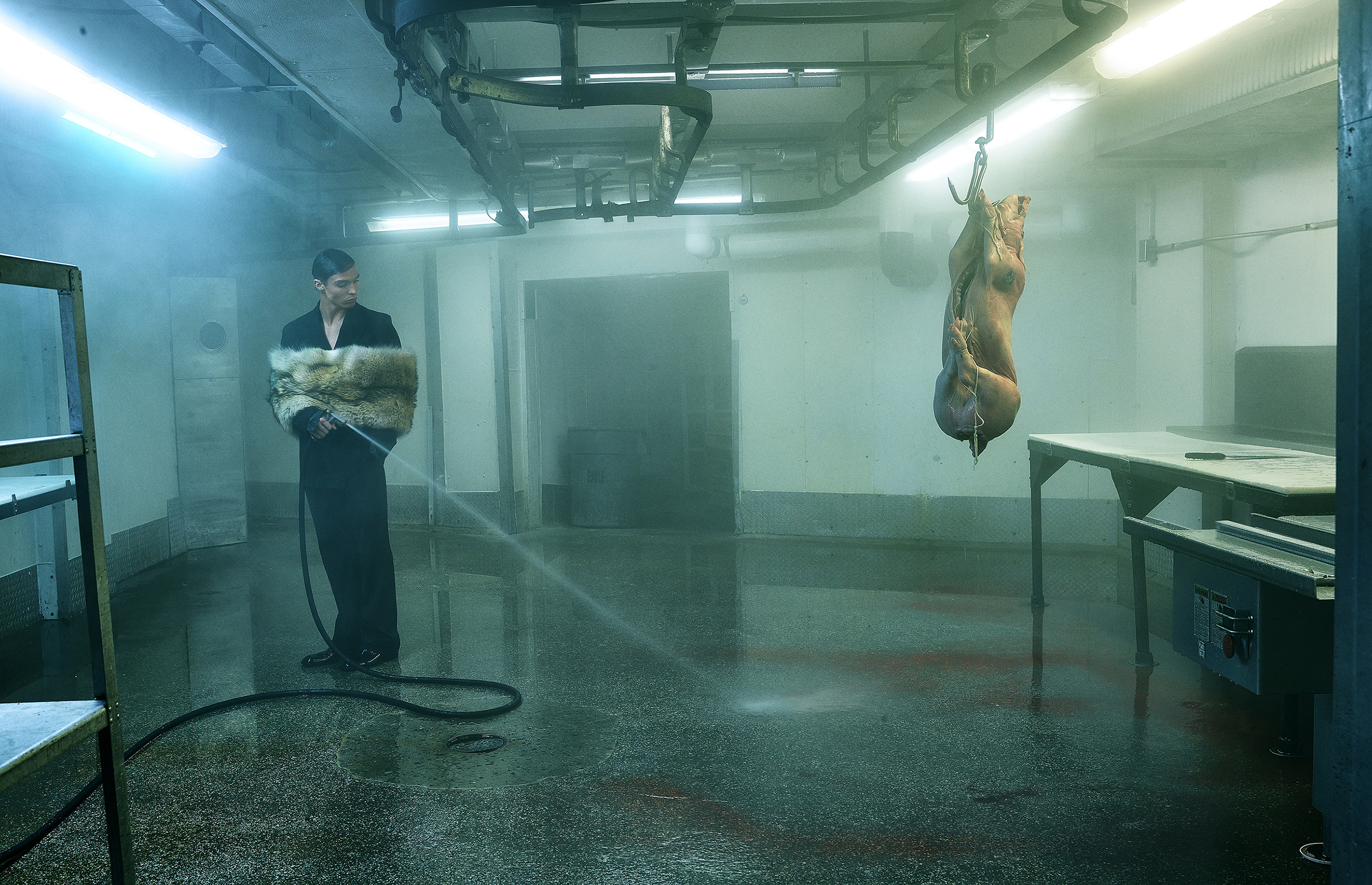 “Clothes really help with finding the character,” says Nicholas, embracing the FACE photography as if it were another on-camera role. Slowly, the sartorial vision crystallises – American Psycho, with Christian Bale as Patrick Bateman in the 2000 film: sleek, tailored, taut and replete with Saint Laurent precision. Perfect attire, then, for the location of the shoot: in the freezer units of the Meatpacking District. One passing worker pauses to squint at the chilling tableau: Nicholas, bare-chested in McQueen runway, standing next to a pig carcass swinging on a hook. “Is that one of the Menendez brothers?” she asks, eyes wide.