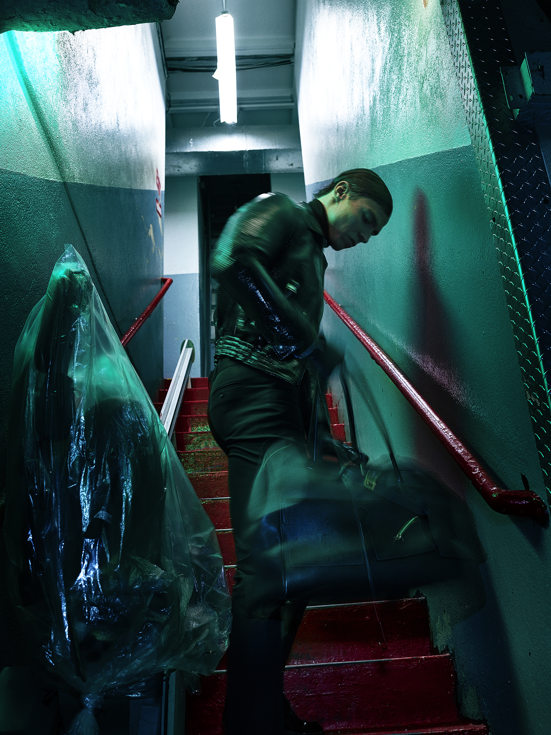 The night before, Nicholas is deep in a fitting in his 40th-floor hotel room, overlooking the Empire State Building. A row of his own Lanvin and Brunello Cucinelli shoes line the floor, each pair carefully placed. He removes his Zegna jeans and stands confidently in his briefs, trying on various outfits: rubber mackintosh, leather galoshes, harnesses, hosiery. His phone rings constantly but he ignores it. Klein sits on the corner of the bed, documenting the proceedings with his iPad, crafting the shoot’s narrative.