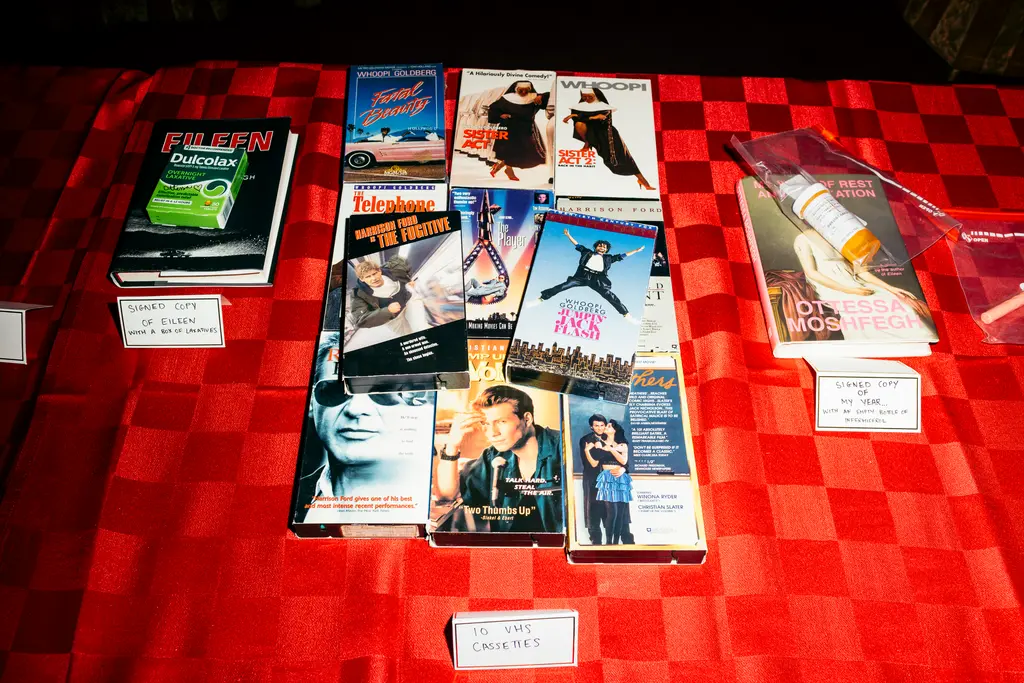 For the occasion, the pair auctioned off a curated mix of personal ephemera and conceptual offerings: a single (used) toothbrush, a signed copy of Moshfegh’s 2018 novel My Year of Rest and Relaxation bundled with a bottle of Infermiterol (really just Vitamin C), ten VHS cassettes, five pieces of vintage lingerie, a prank call, a painting, lunch at the Russian Tea Room, martinis at the Chelsea Hotel, a leather jacket, two hours of writing therapy on Zoom, and a signed box of laxatives paired with 2015’s Eileen.
