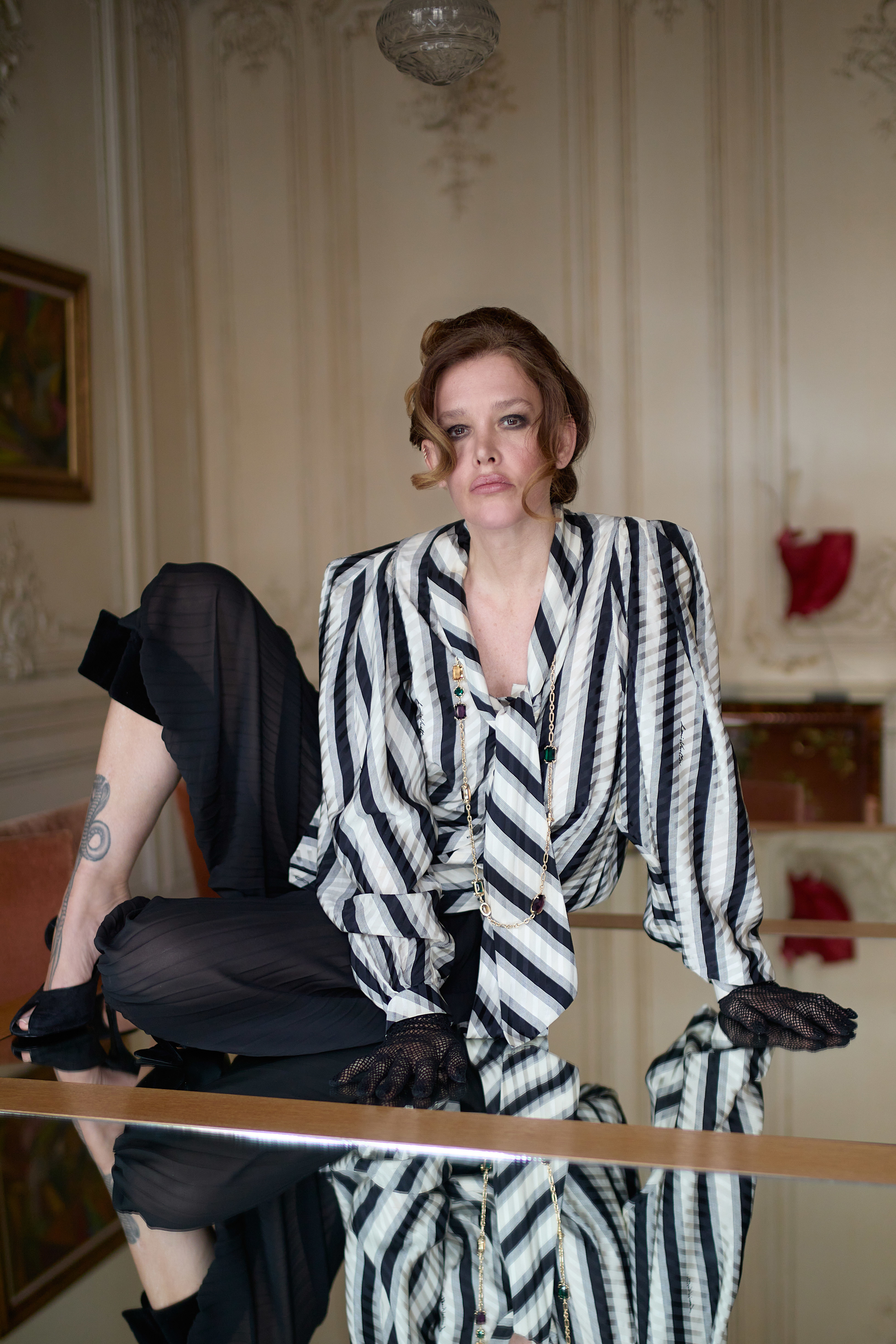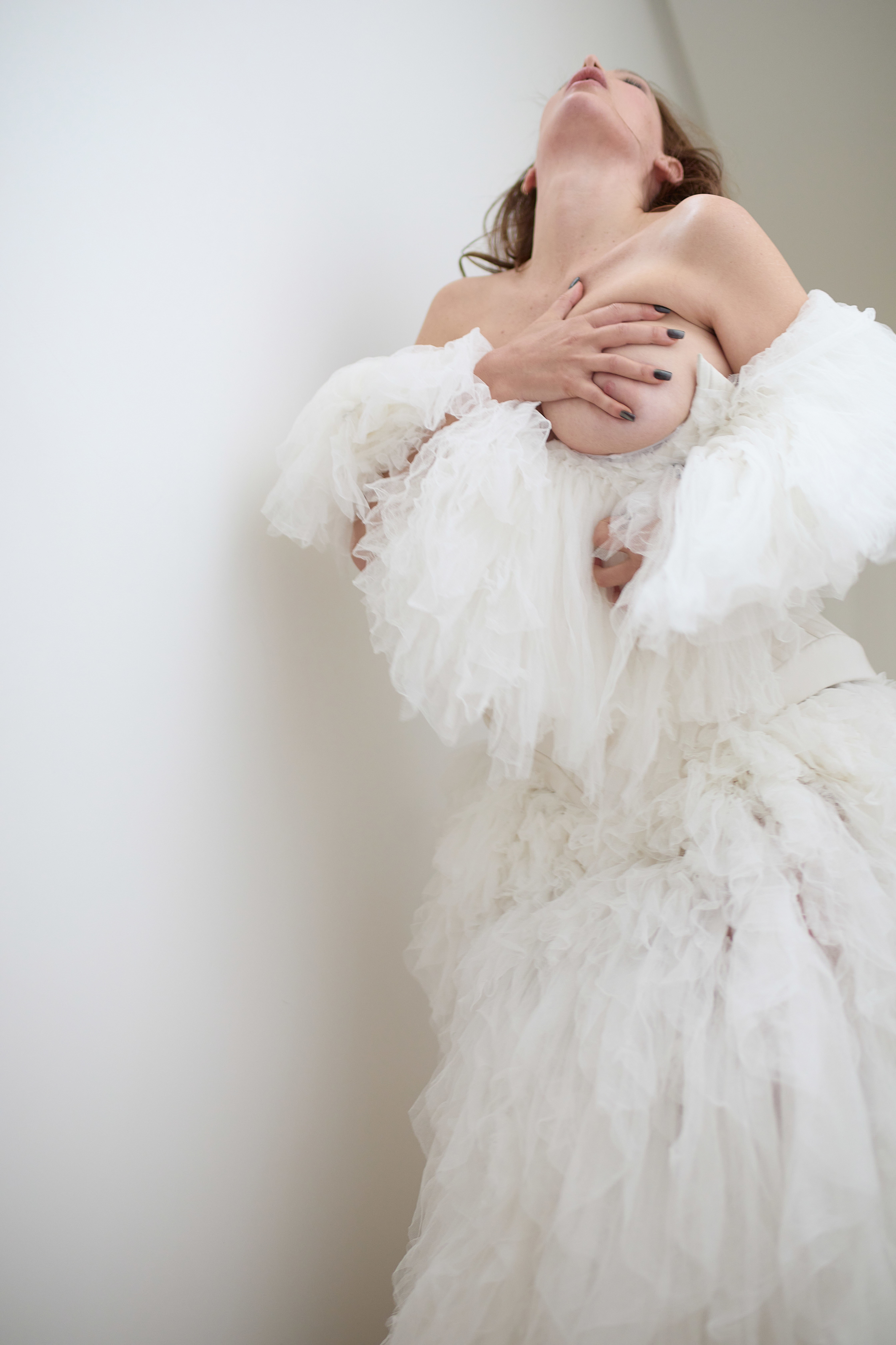 Paz wears bra AGENT PROVOCATEUR, skirt stylist’s own, tights CALZEDONIA, shoes JUDE, hair accessory BALENCIAGA and gloves DENTS
