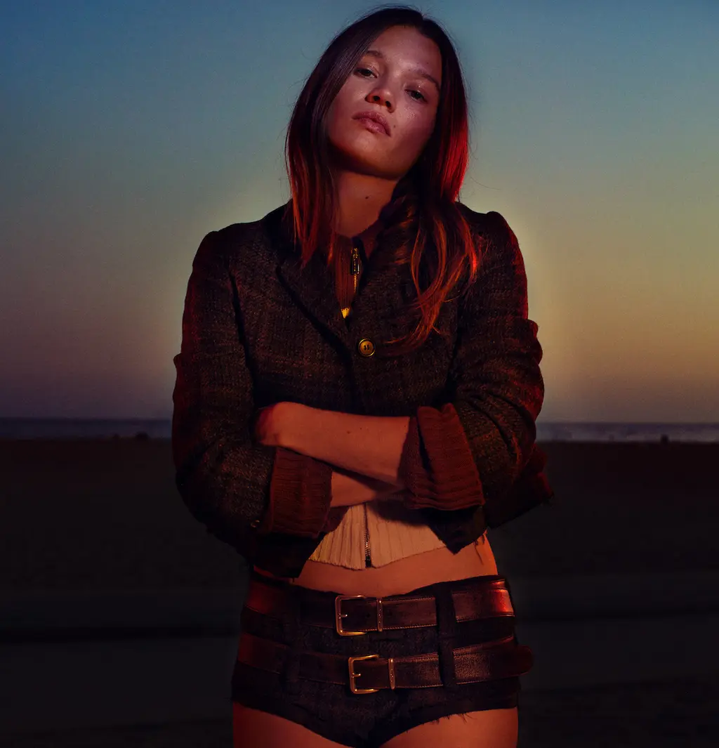 Rain wears jacket, jumper, shorts and belts MIU MIU