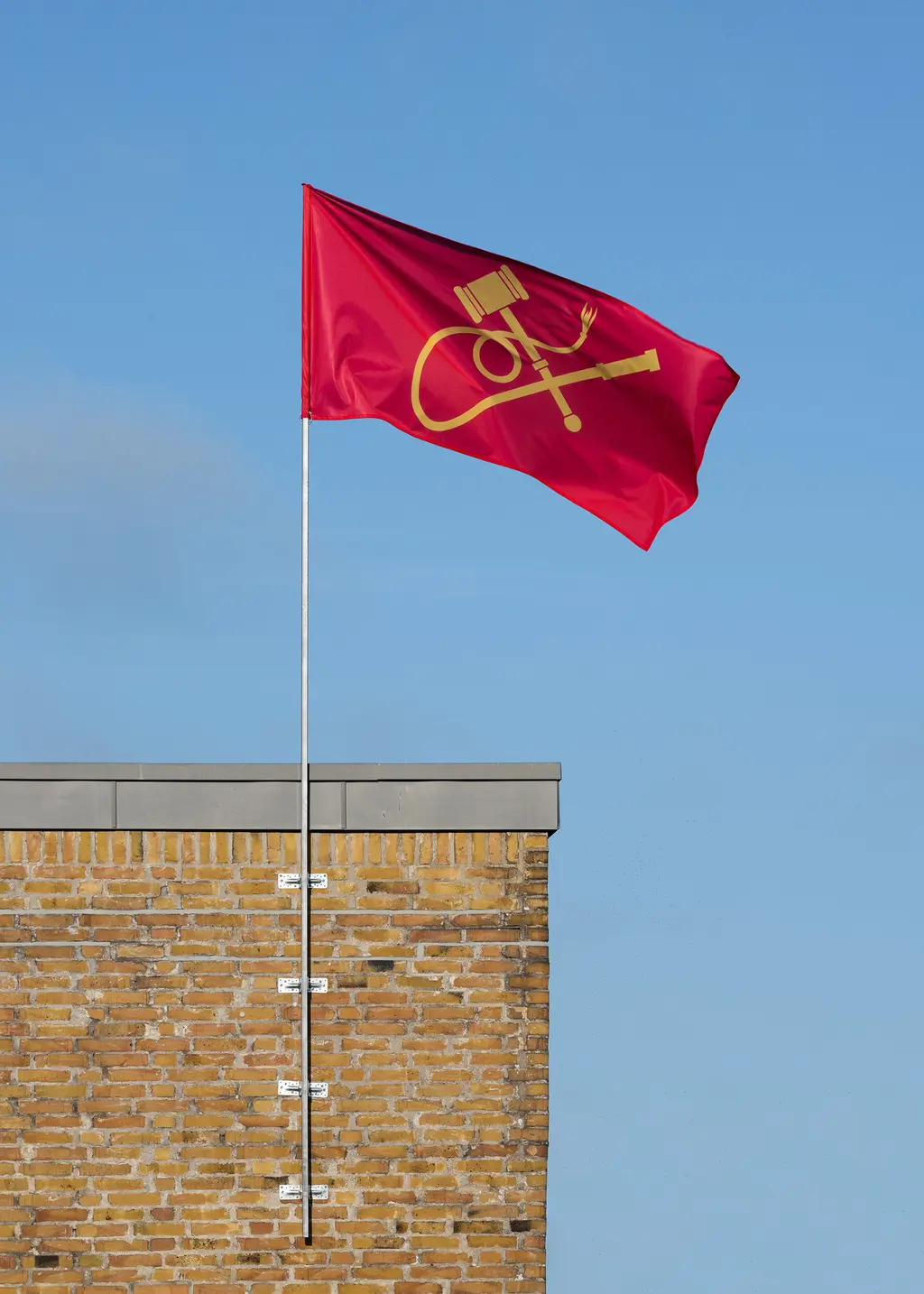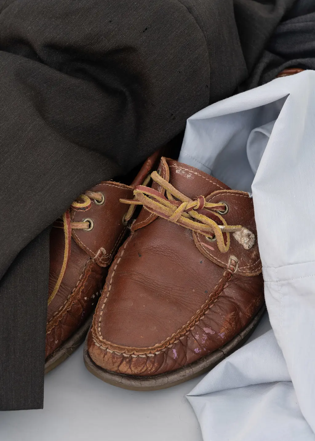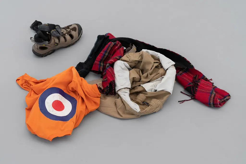 The outfits in the exhibition are all from my different subs. While it was being installed, I had a man come to the gallery to dress and undress in each outfit. This meant that the man watched himself in the mirrors, with the image of me being violated on them. The clothes are tragic – most men’s clothes are – especially when you look at them on the floor, much like a used condom. I like to look down at men. The design for the flag was also made by a sub on my instruction. I am fulfilling my own sensationalism with it, which was recently catapulted via an unfortunate right wing media storm a few years ago. I want to own my aggrandisement.