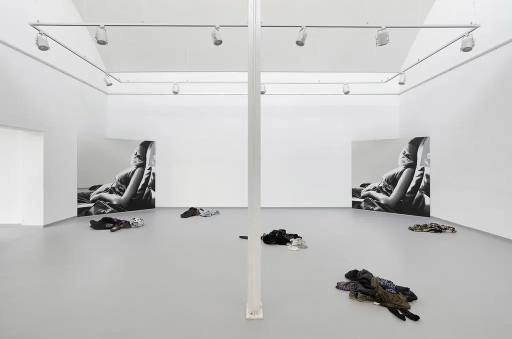 The next day, after we’d separated at the airport, I discovered he’d visited my friend’s gallery to try and find me. I then looked at my phone to find he’d contacted me in various ways, even though I’d ignored his attempts to get my number. Then I found out he’d also posted a photo of me sleeping on the plane. This image is printed on the four mirrors in the exhibition. Each mirror faces the other, creating an infinity effect. It’s impossible not to look at yourself in one the mirrors, to confront yourself. What happens when a dominatrix is vulnerable?