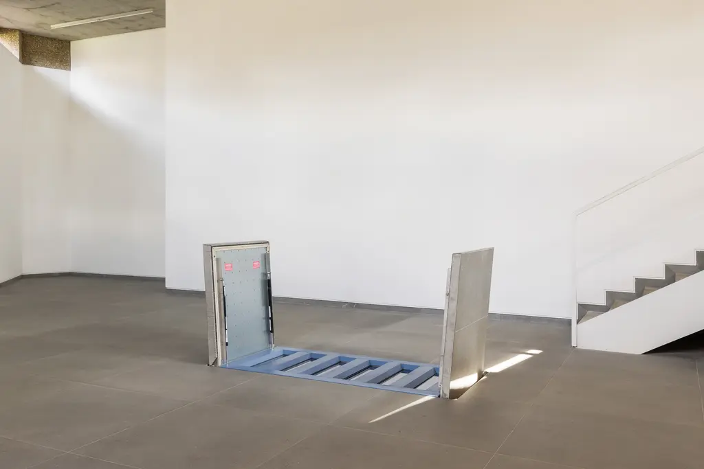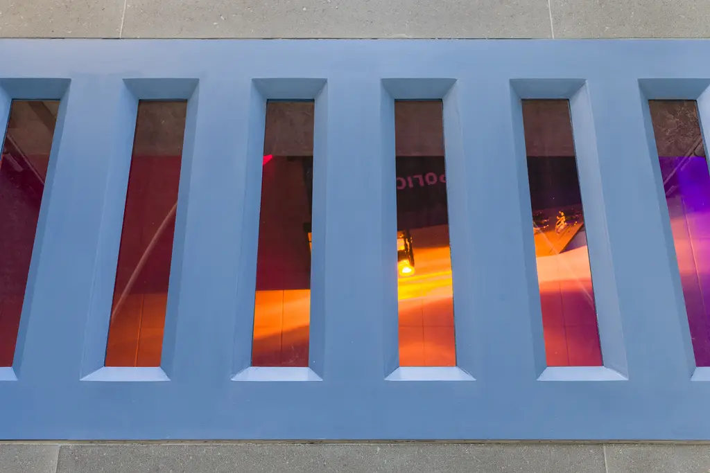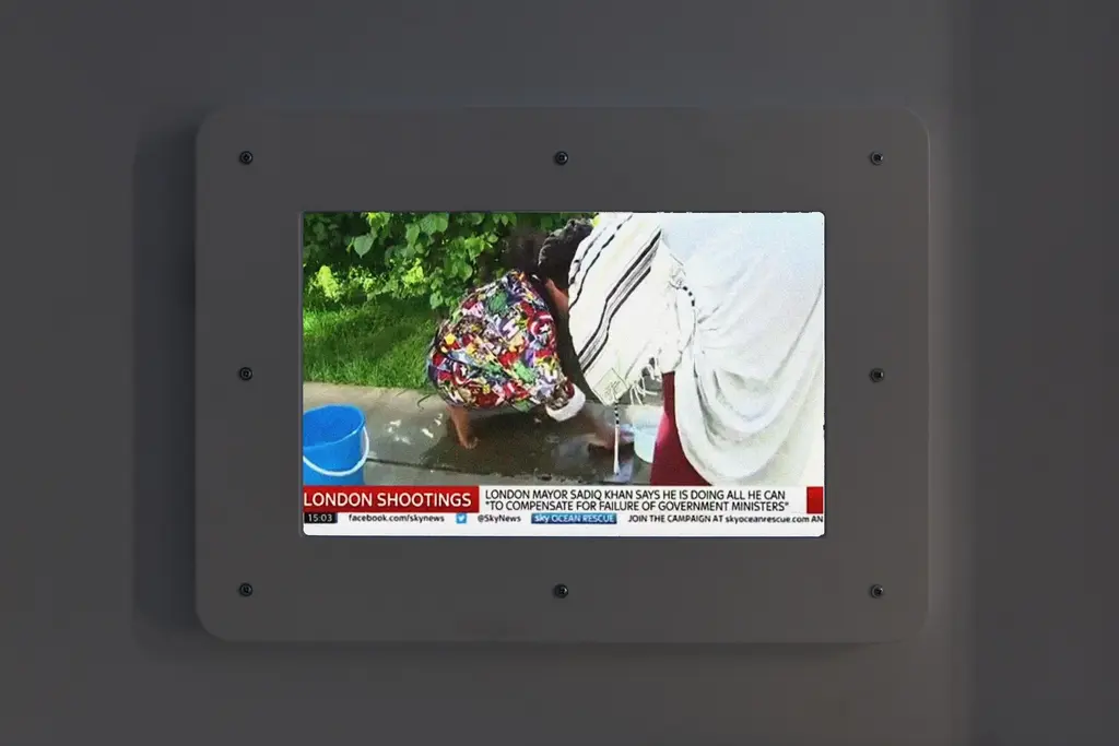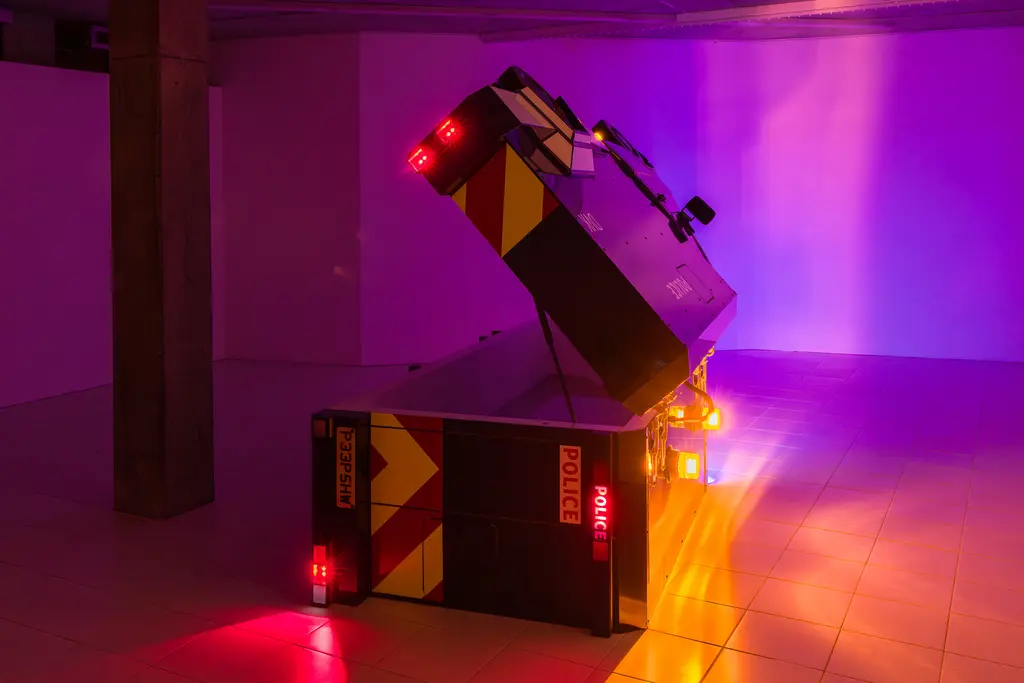 This new show, however, is unexpectedly minimal. Entering Anti-Blackness… is to face only a prison door, laid flat in the middle of the room, perspex windows revealing flashing police lights below.