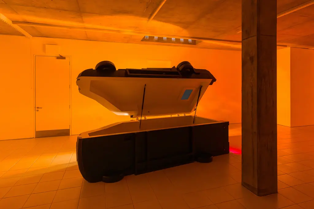Audience members are encouraged to lay down on the coffin’s seatbelt-equipped bed, have the lid closed, and view 101 hour psycho (2024 – 2025): 101 hours’ worth of UK drill-related footage that R.I.P. has been screen-recording and downloading onto hard drives since 2018.