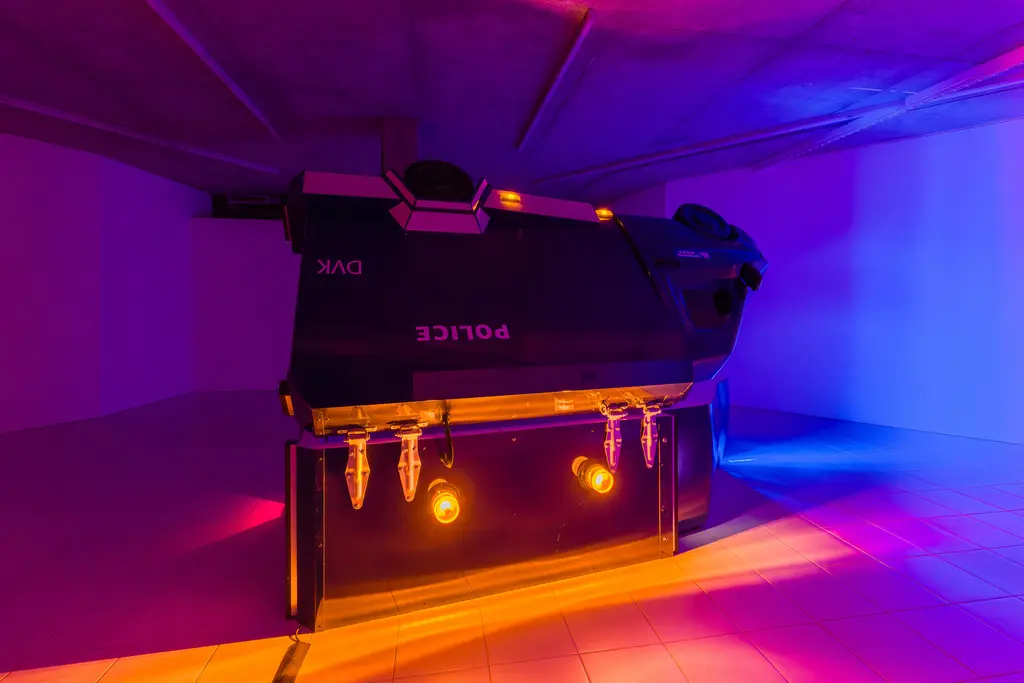 Downstairs, inside a basement that’s been sterilised with disinfectant and had its temperature set to five degrees celsius – the standard in British morgues – a police escort van is turned on its side, mimicking a coffin.