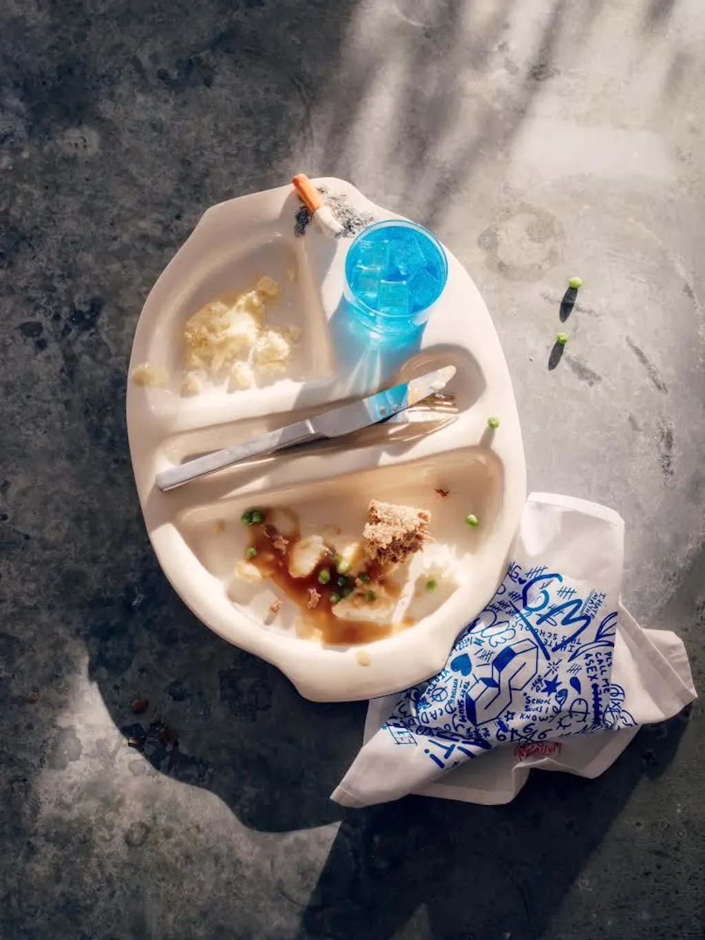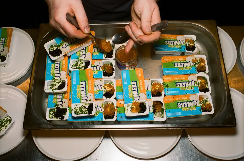 Not so hard to swallow: the School Dinner Club menu dreamt up by Munslow and McCallum, which included Dairylea Dunkers with wild garlic and caviar; oysters stuffed with Space Raiders and green sriracha; a giant Gruyère Wotsit with truffle honey on top; duck rillette dinosaurs; and, last but not least, a Nokia 3310-shaped choc-ice. This was all served up at Coal Rooms on a bespoke meal tray designed by artist Alma Berrow, and washed down with Lambrini and spiked Big Time bubblegum drinks.