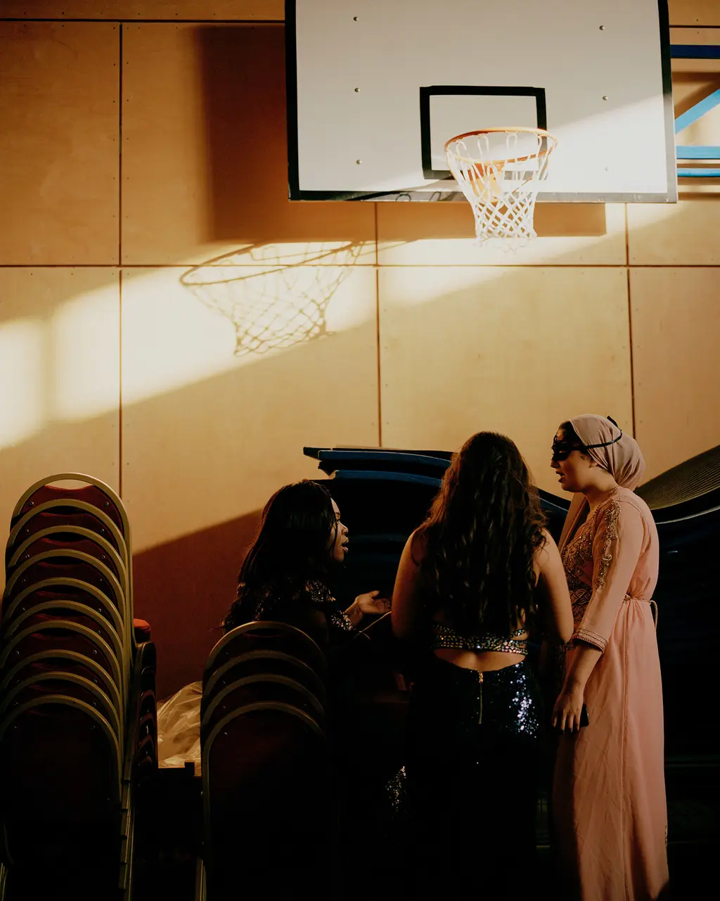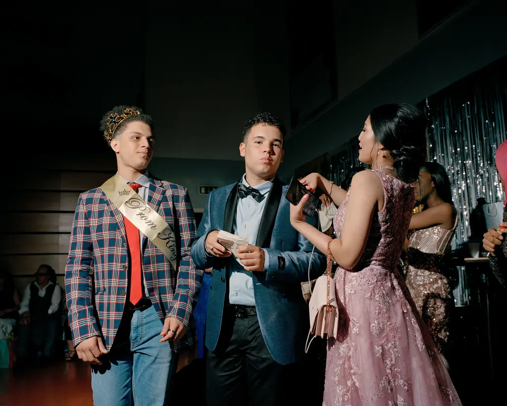 In 2018, having seen the students pouring out onto the street for a few years, Khan reached out to the school for permission to take portraits and video clips of them at prom, unsure of where the project might take him but certain that the event was too special not to archive. He always felt drawn back. Year on year, filming the students became a ritual and he was able to trace their journeys from the red-carpet entrance at the school to the heated flashing of the dance floor, and back out into the night, revealing snatches of their personalities along the way.