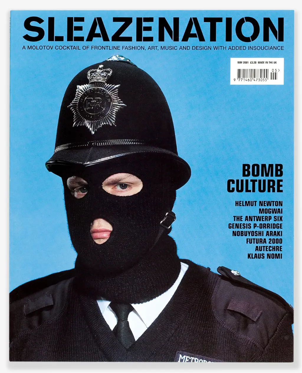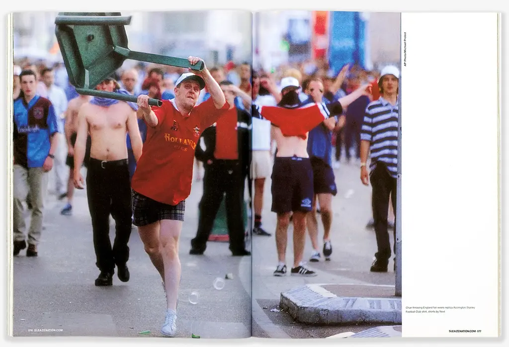 King was proper outré. On one of his Sleaze covers, from May 2001, a copper wears a balaclava with “BOMB CULTURE” written boldly on the side – a purposefully controversial cover he admits he hoped would get pulled from newsstands. A month later, there was feature Epidemic: a fashion story. Probably one of the greatest fashion editorials of all time (honest), it features football hooligans dressed – and properly credited – in sports casuals, photographed while wrecking havoc at a match in real time.