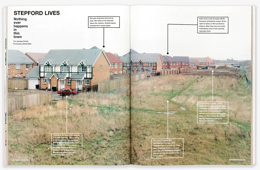 Earlier that year, there was Stepford Lives, photographed by Daniel Stier and written by Jacques Peretti. It took the mundanities of British suburbia and turned it into a fantasy soap opera, viz: “Sue gets migraines that last for days. She takes to her bed and draws the curtains. Graham hasn’t touched her in years.”