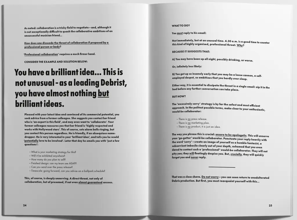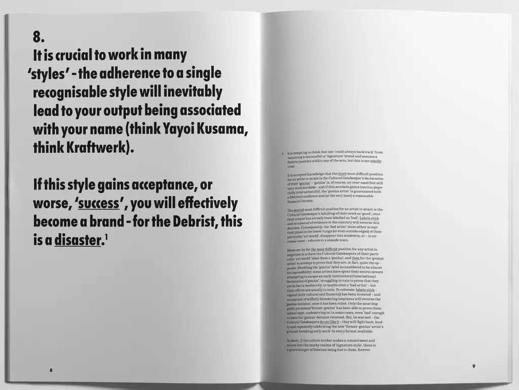That’s when he came up with the concept of Debrism. It’s an idea he’s chewed on for a while that has now been immortalised into The Debrist Manifesto. In simple terms, it’s a guide, set down in a bound book, for those lost souls trying to find their way in life through an endless – but endlessly unresolved – question: “What actually is it that I do?”