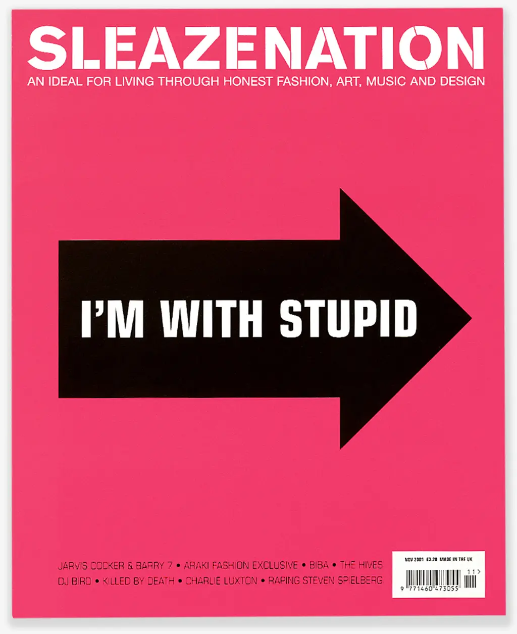 From the early 1990s his work has been a recognisable icon of Great British Design, whether from his tenure as art director of i‑D mid-decade, his block-coloured posters telling you to piss off (often proudly held up these days by his young daughter on Instagram) all the way up to his defining work at do-it-your-fucking-self cultural bible, Sleazenation, where he was art director from 2001 – 2003.