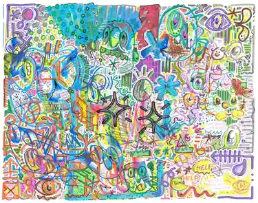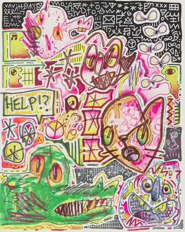 My inclusion of those words were a bit tongue in cheek, but with that comes a sense of truth. Words like “help” or “please” were most likely how I was feeling due to the loss of my parents at a pivotal moment in my life. I always juxtaposed those harsh words with light-hearted characters, symbols and colours to try and hide the fact that I was hurting in those moments. I was always in search of balancing heavy emotions with a sense of hope. I was writing out my thoughts like one would in a diary – but my diary was my drawings.