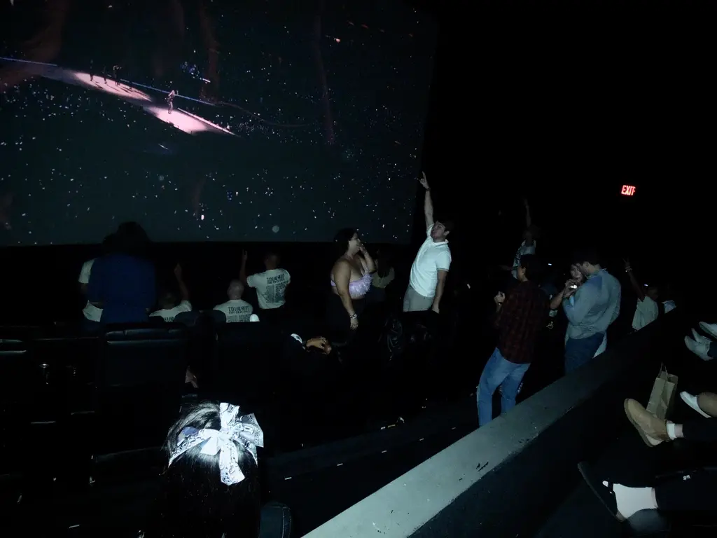 By the third song, girls timidly have got out of their chairs and are hovering behind us. By the fourth, they’re dancing. By the fifth, Liv and I are, too. Somebody records the screen like she’s at the concert. As we danced, my cynicism melted. Anything that makes teenage girls this happy can’t be bad, right? For the first time since I was 13, I was soberly dancing on a Friday night. There, in the back of the AMC, the darkness allowed a release of inhibition as we danced under the gentle guidance of nine-foot-tall glowing Taylor Swift. Halfway through the screening, a gaggle of AMC employees crept into the back of the theatre and swayed, mesmerised.