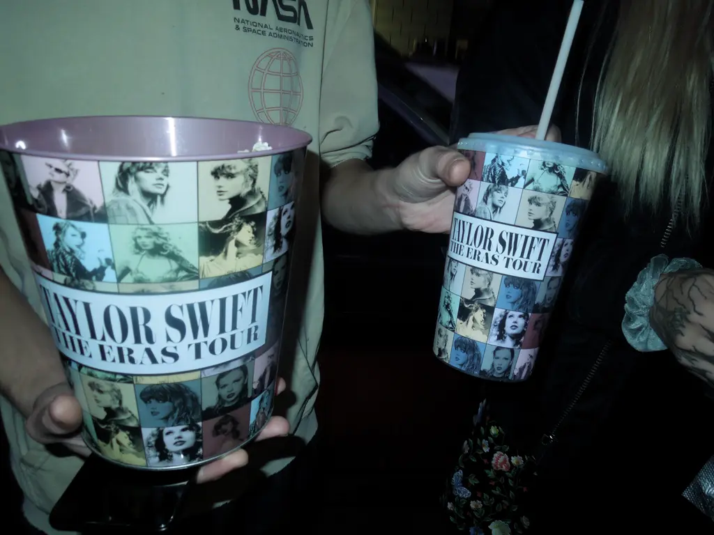 Inside the AMC lobby were women and preteens dressed in what looked to me like seemingly normal outfits. Kerwin shook his head at my ignorance and explained the cardigan thing. They were references to Taylor’s song Cardigan, in which she sings about a cardigan – maybe it’s also about Karlie Kloss, but it seems like everything maybe is about Karlie Kloss. Then Taylor sold cardigan merch which resells for $500. I counted seven homemade Junior Jewels shirts (You Belong With Me music video). A large group of nine-year-old girls had been so nervous that the special Eras AMC merch – a tin bucket filled with popcorn – would be sold out that they made a belaboured mother (sporting a 2015 On The Pavements Chanel messenger bag retailing for 11k) bring them early to secure the tins.