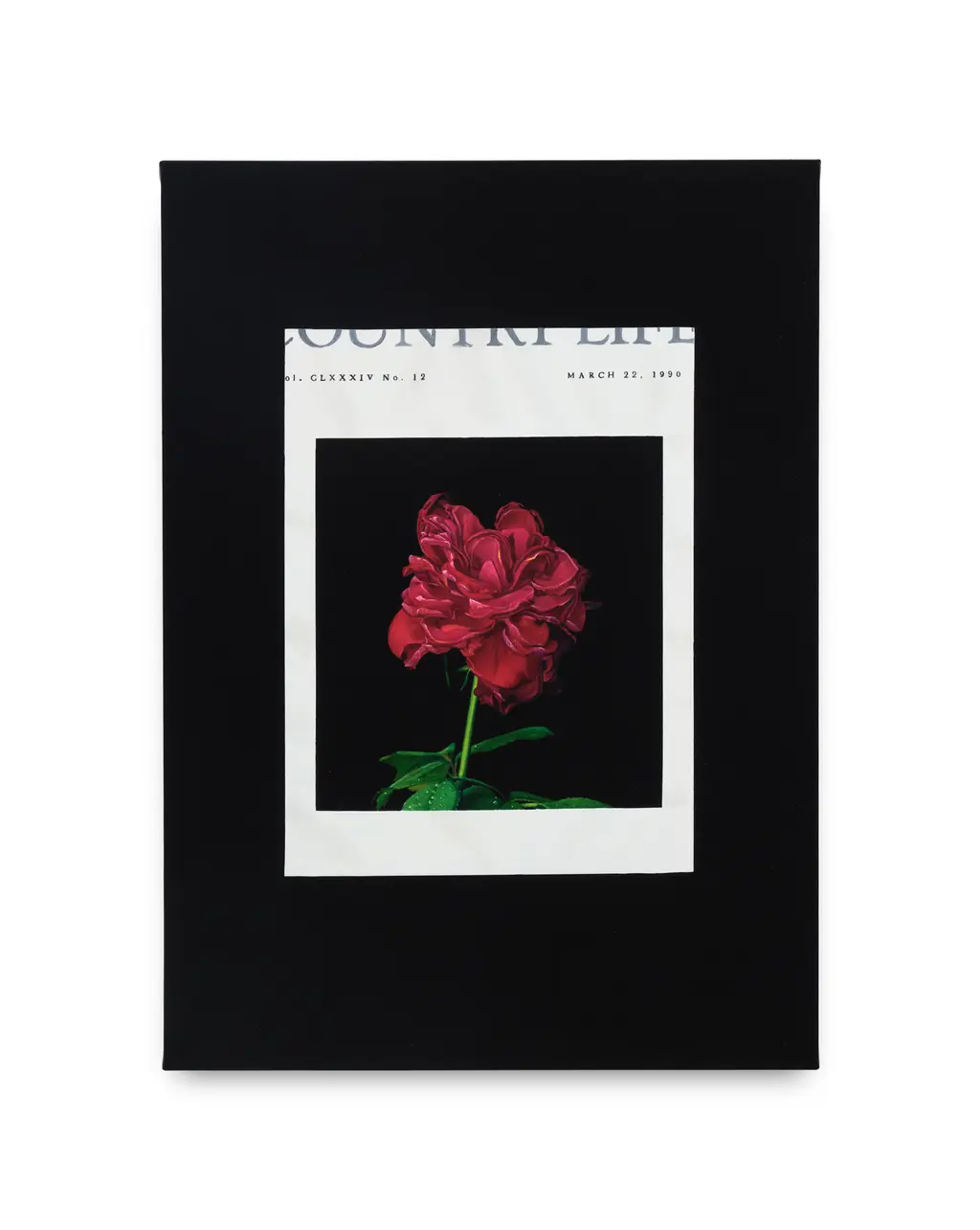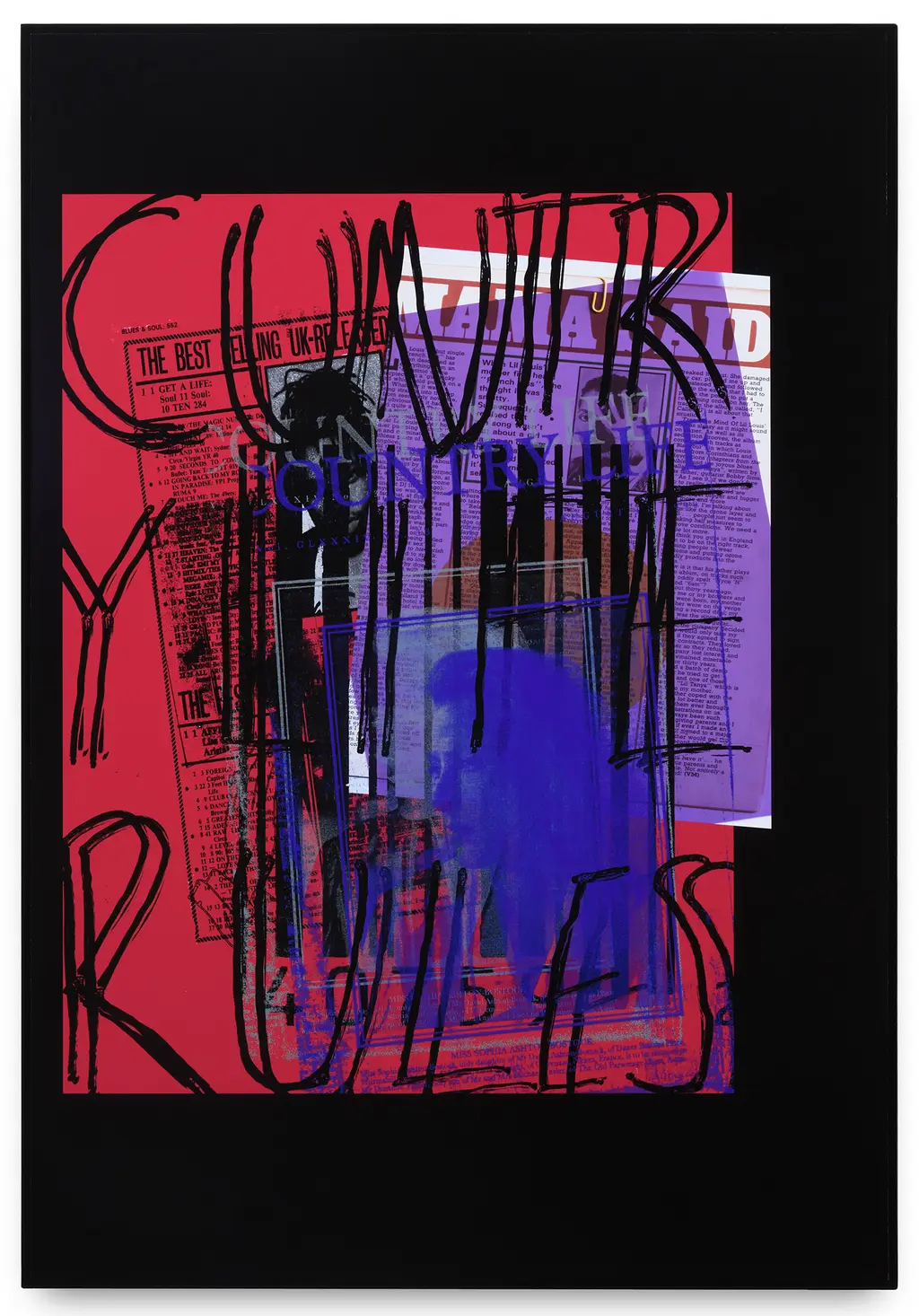 With that in mind, the new work features artefacts and imagery borrowed from British folklore, interspersed with collages constructed from the artist’s own collection of contemporary ephemera, such as a screen-printed image of a couple snogging with “It’s a black thing” written boldly underneath and various roses scattered throughout the pieces. Barclay also looked to clippings of 19th-century pamphlet The Boy’s Own Paper and its cultural relevance to Britain’s public schools.