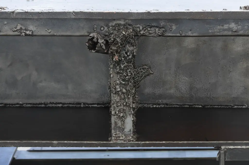 In London this autumn, he is showing works from two series, TABLES and ACTS (purposeful capitals, artist’s own), at the Gagosian gallery. The former is a huge metal sculpture, built of the discarded ironwork benches of his studio’s previous occupants, reprocessed by Sterling with dripping, shining metal droplets. The latter are blocks of clear urethane filled with mists of dye, made static, frozen as they unfurled, resting on elegantly stained, graffiti-soaked Formica. TABLES and ACTS are both monuments to the terrible beauty of change and the century just gone.