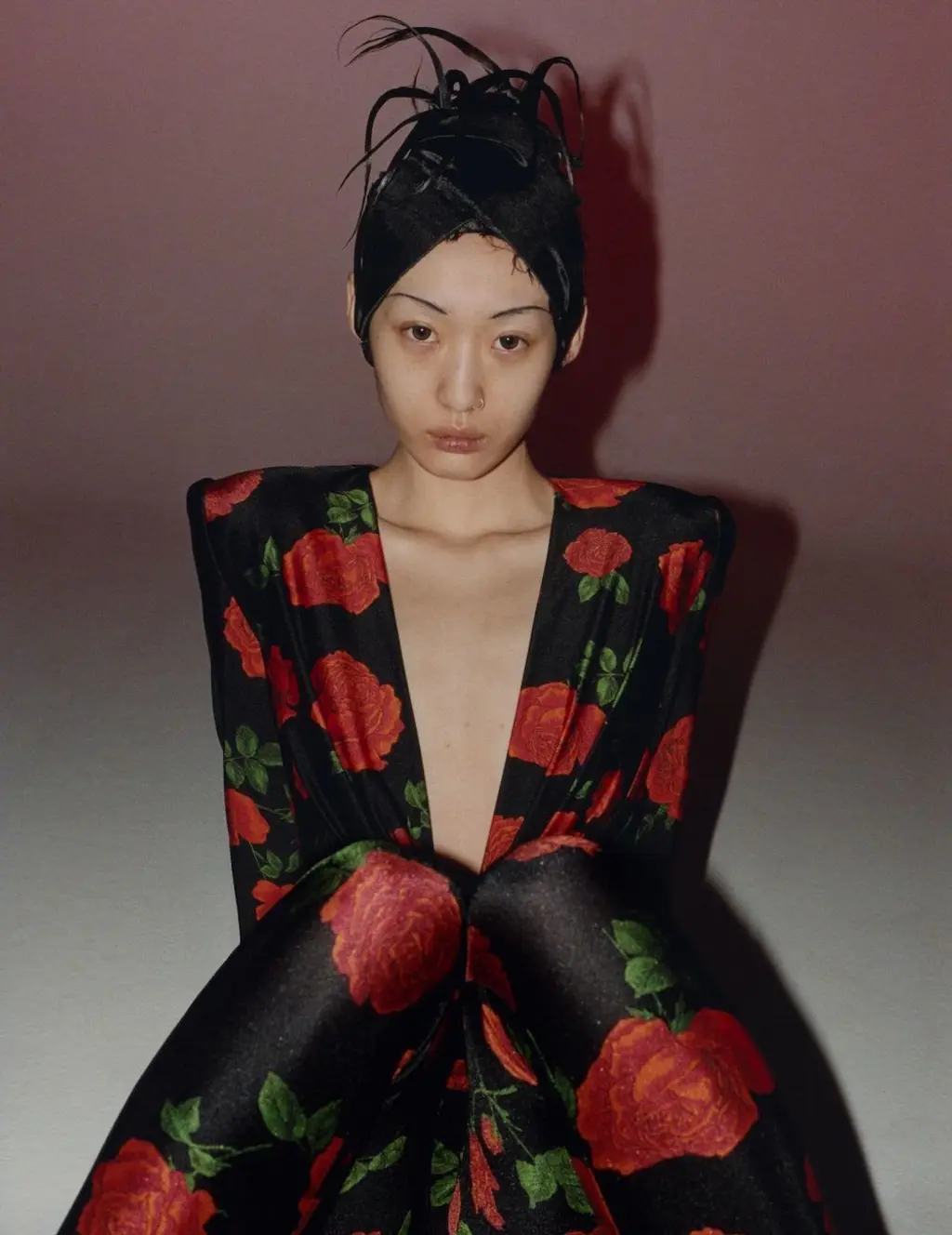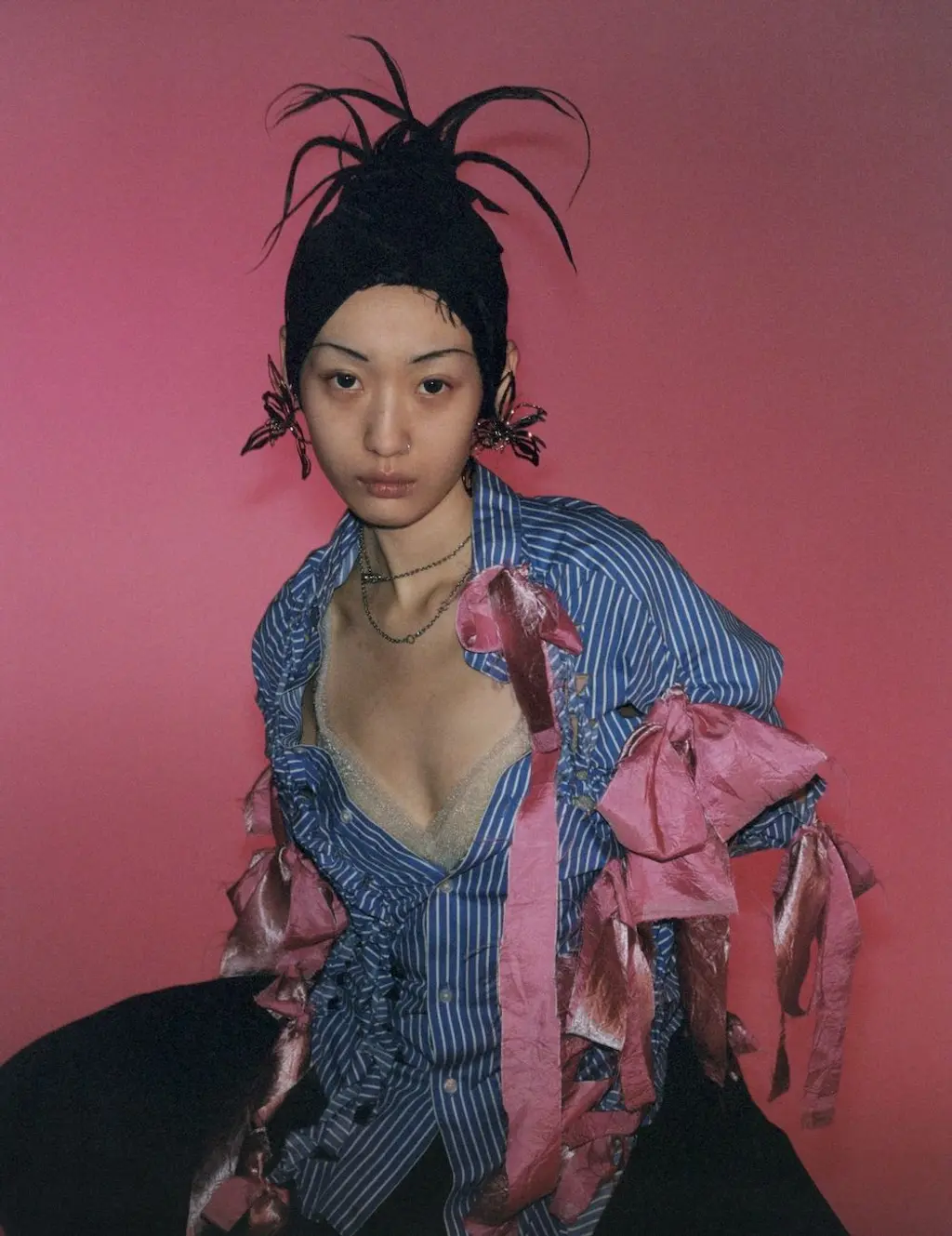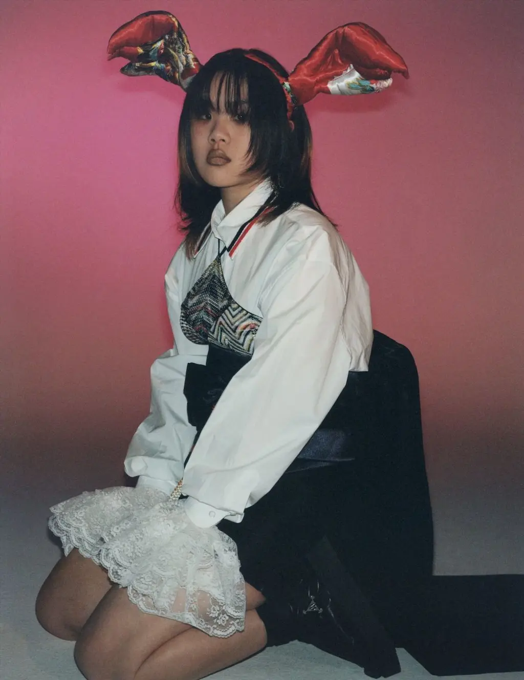 Hyun wears top MISSONI, shirt MIU MIU, obi belt and lace cuffs THE ARC LONDON, shoes and socks HERMÈS, earrings Y/PROJECT and headpiece hairstylist’s own