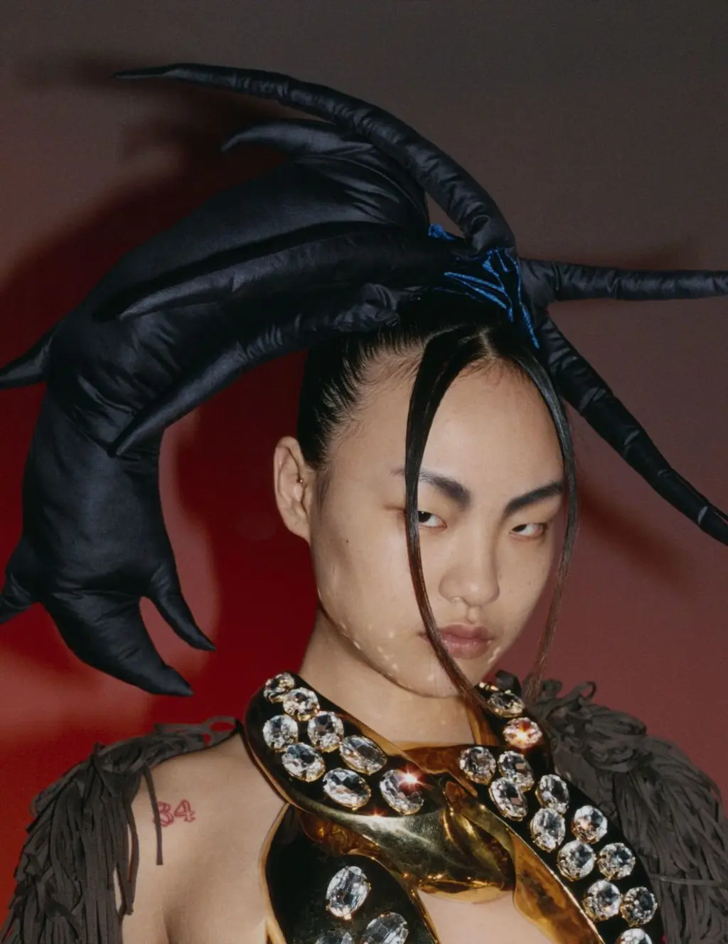 Byul wears top BALMAIN, sleeves VAQUERA and headpiece hairstylist’s own