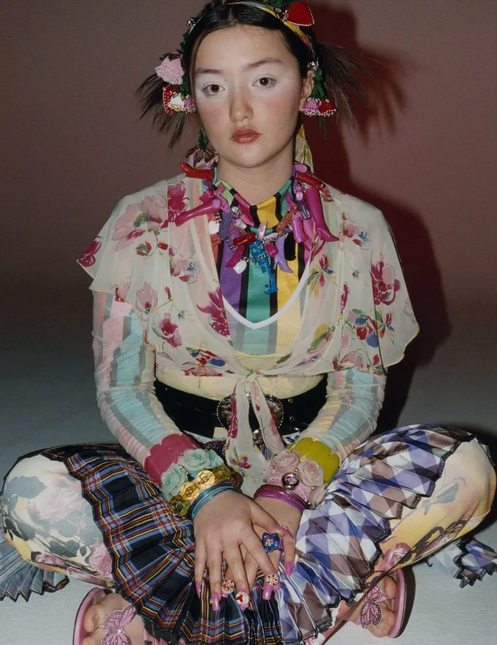 Leese’s initial reference for the shoot was the subversive photographs of Japanese photographer Nobuyoshi Araki, whose work is often tied to underground themes of bondage and eroticism. But Araki also explored the hyper-coloured styles and subcultures of Tokyo’s teens in his projects, such as his 1992 collaboration with Nan Goldin for the Tokyo Love.