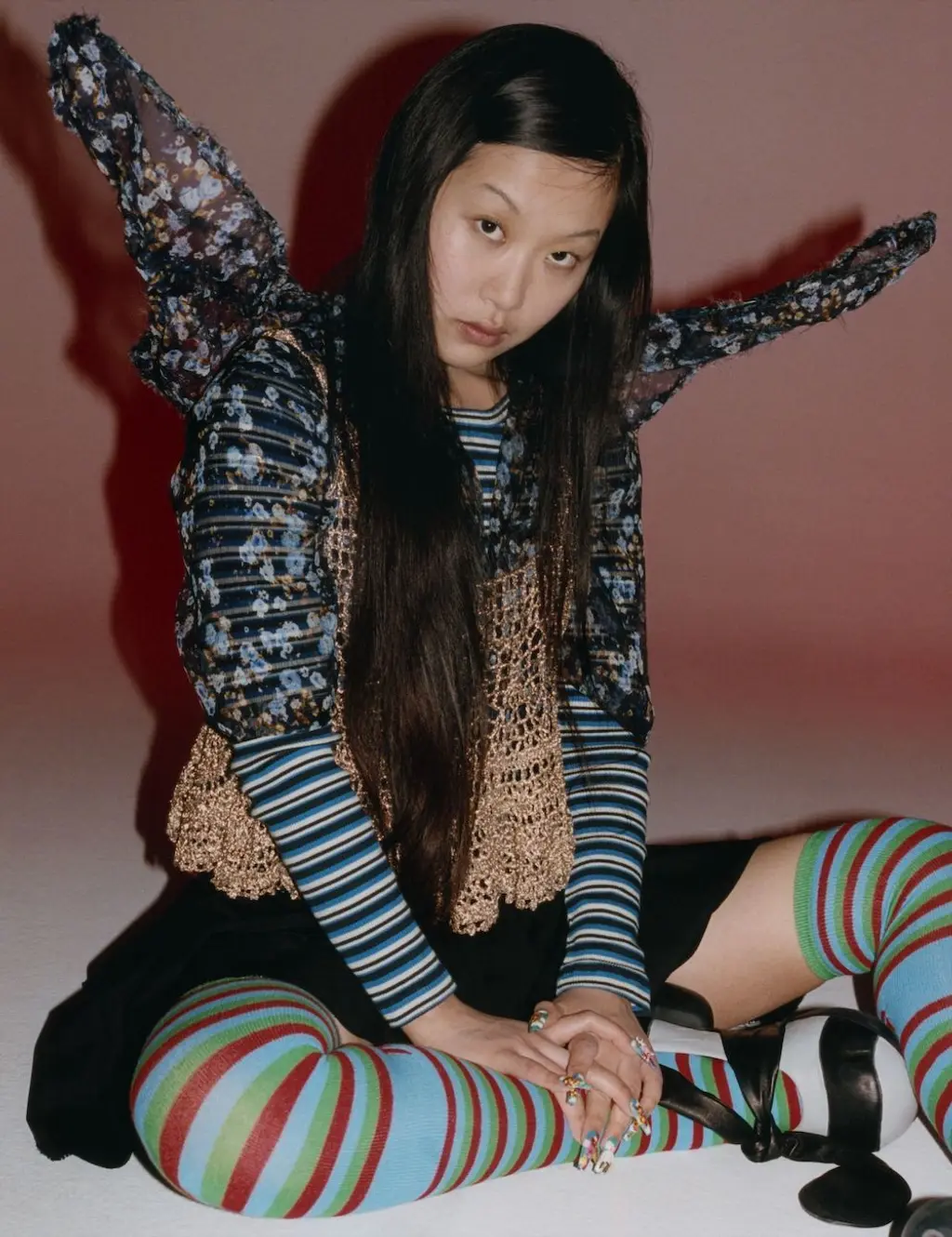 Chengzhen wears crochet top and striped top (worn underneath) THE NATIONAL THEATRE, shirt and wings DSQUARED2, skirt MIU MIU, shoes VENICE W and socks MOLLY GODDARD