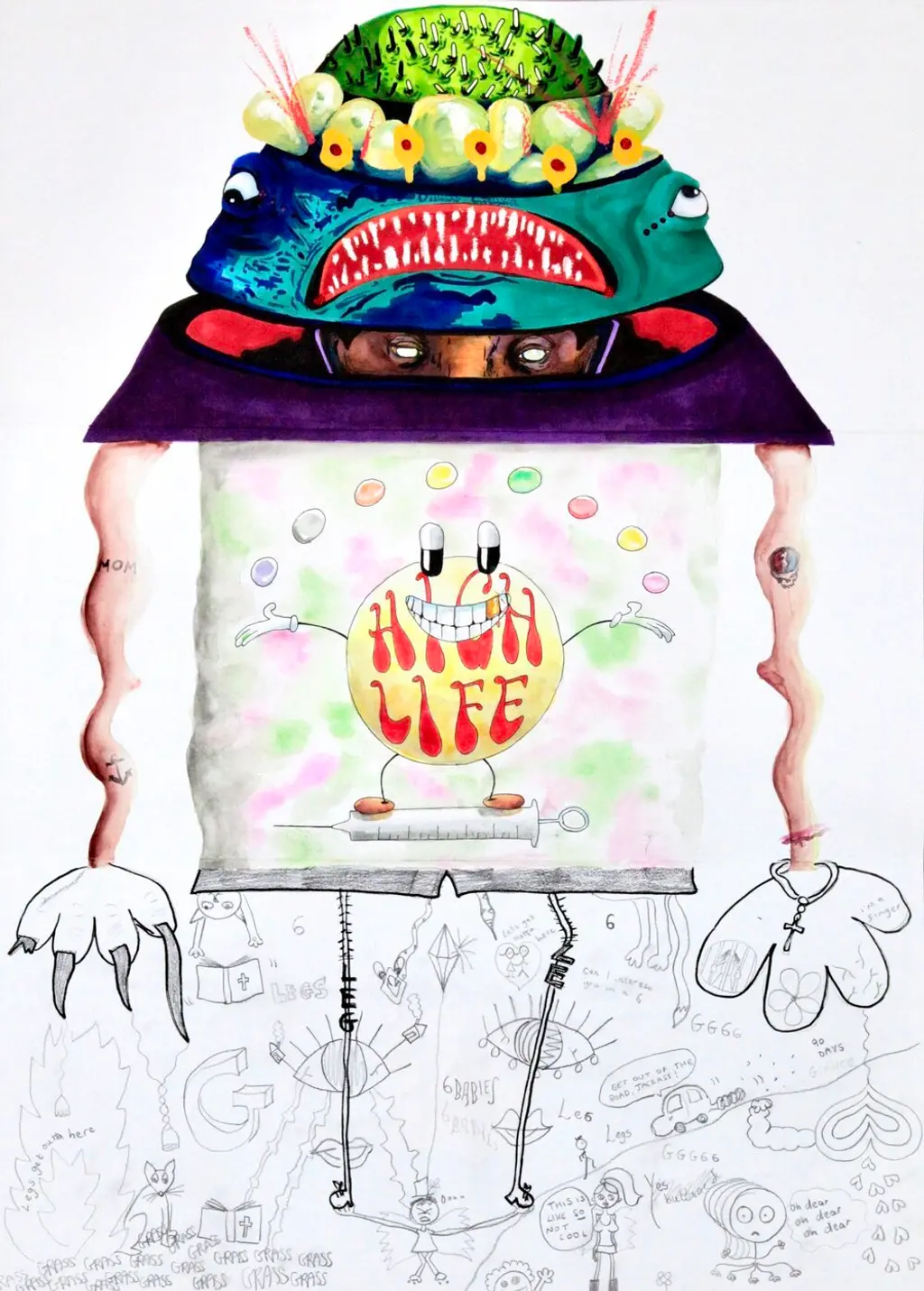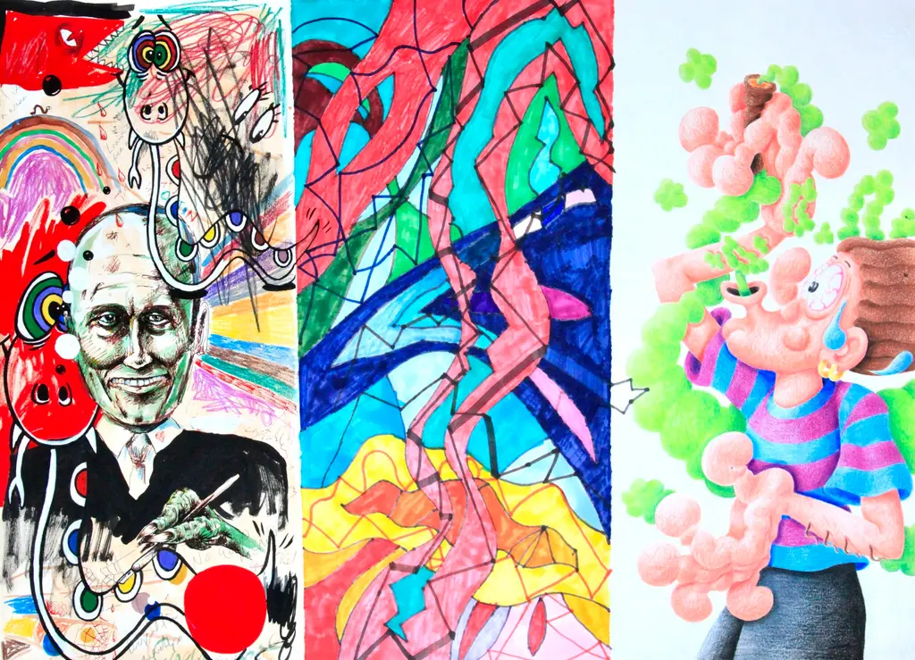 Barry Reigate, Kian Hardy and Joe Cheetham. The Correspondence, mixed media including pencil, paint, crayon, ink and marker pen on Fabriano paper, 50cm x 70cm, 2020
