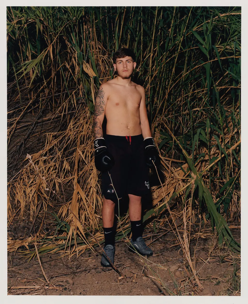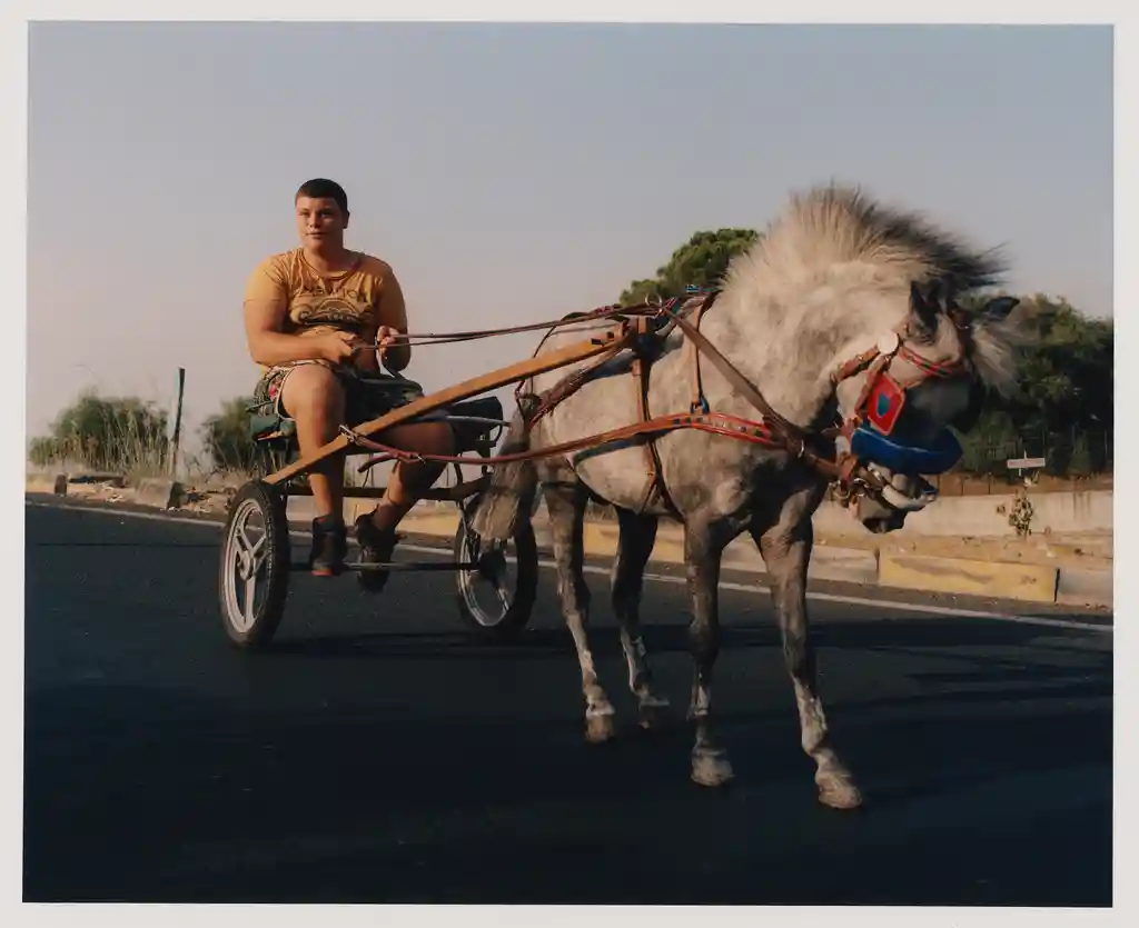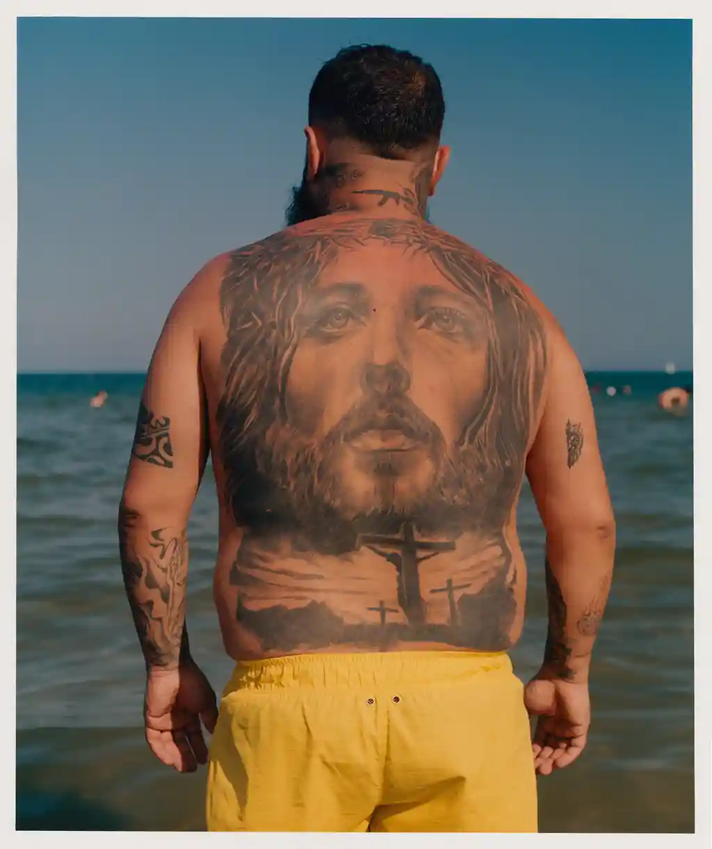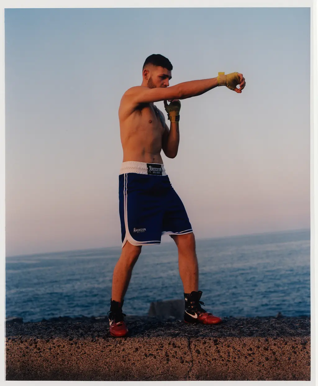 The result is Catanian Men – a series of docu-style photographs depicting the men of the Sicilian city. A young boy rides a horse and carriage, while a heavily-tattooed back piece is captured soaking up the summer sunshine on the beach. In another image, a toddler points at a nondescript subject in the distance, while the boys Cottle initially met by the boxing rings throw air punches and upright stances against a sunlit backdrop.